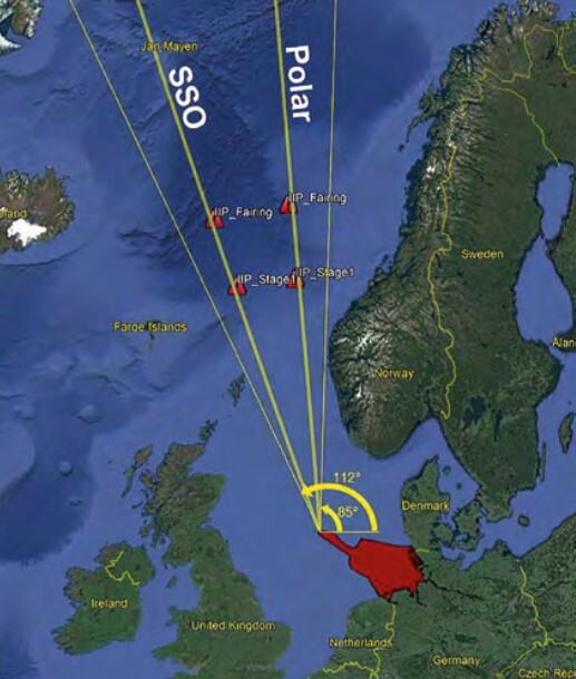 Man sieht, dass die Startsektoren nicht überlappen: GOSA zielt mehr nach NordWest; EuroSpaceport eher nach NordOst.
