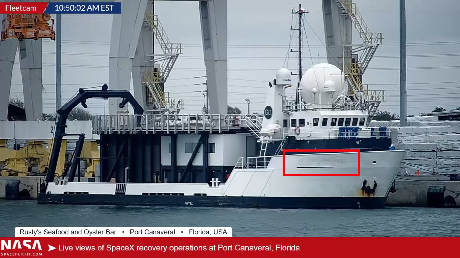 SpaceX hat offenbar seine beiden Dragon Bergungsschiffe GO Searcher und GO Navigator umbenannt zu Ehren seiner ersten beiden weiblichen Astronautinnen in Megan und Shannon. Es wird vermutet das die beiden Schiffe von GO gekauft wurden. Die Schiffe GO Searcher und GO Navigator sind nicht mehr auf der Guice Offshore (GO)-Website aufgeführt. Im Hafen ist man unterdessen dabei die alten Namen zu übermalen.