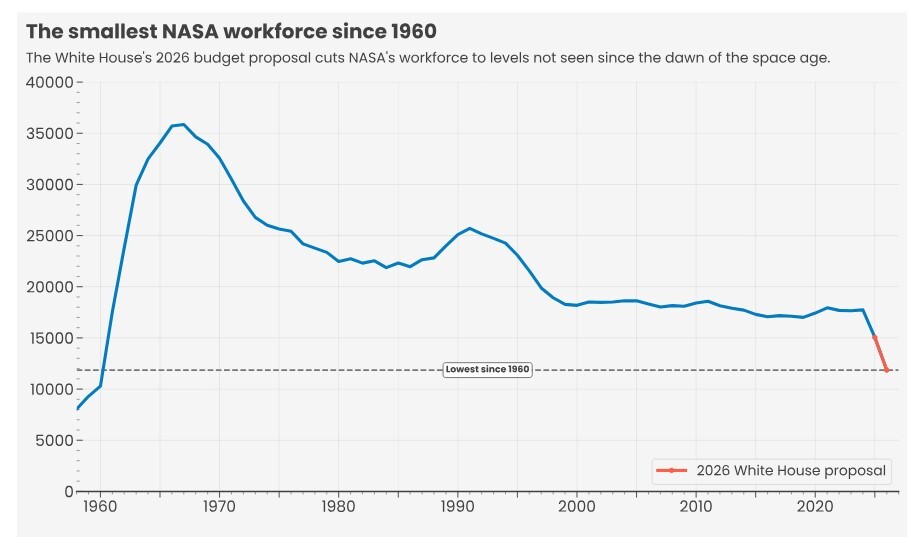 Darin u.a. ein Vergleich der aktuellen Mitarbeiterzahlen bei NASA: niedrigster Stand seit 1960: