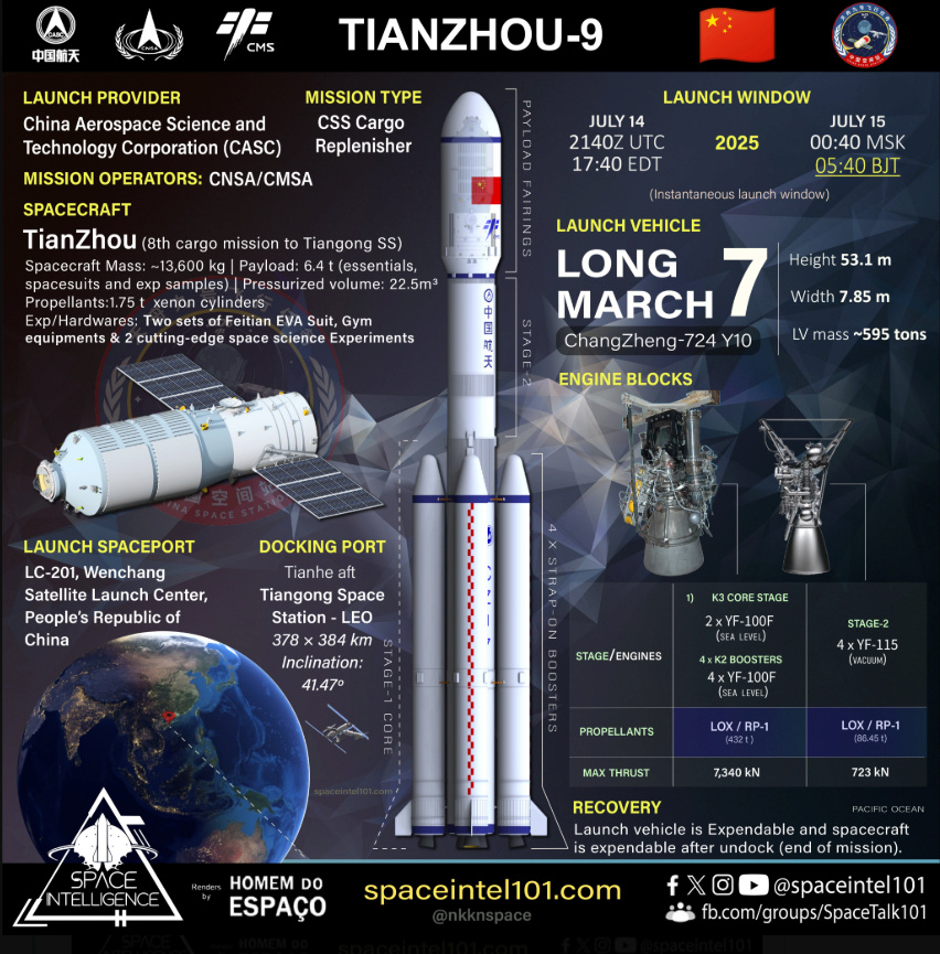 Patch TZ-9Das Frachtschiff Tianzhou-9 ist die neunte Versorgungsmission und die achte zur CSS mit 7,4 Tonnen Fracht, ist für den 14. Juli geplant und soll dort etwa neun Monate bleiben. Das Startgewicht des Frachtschiffs Tianzhou-9 beträgt 14 Tonnen.