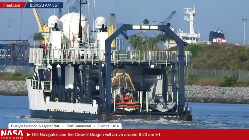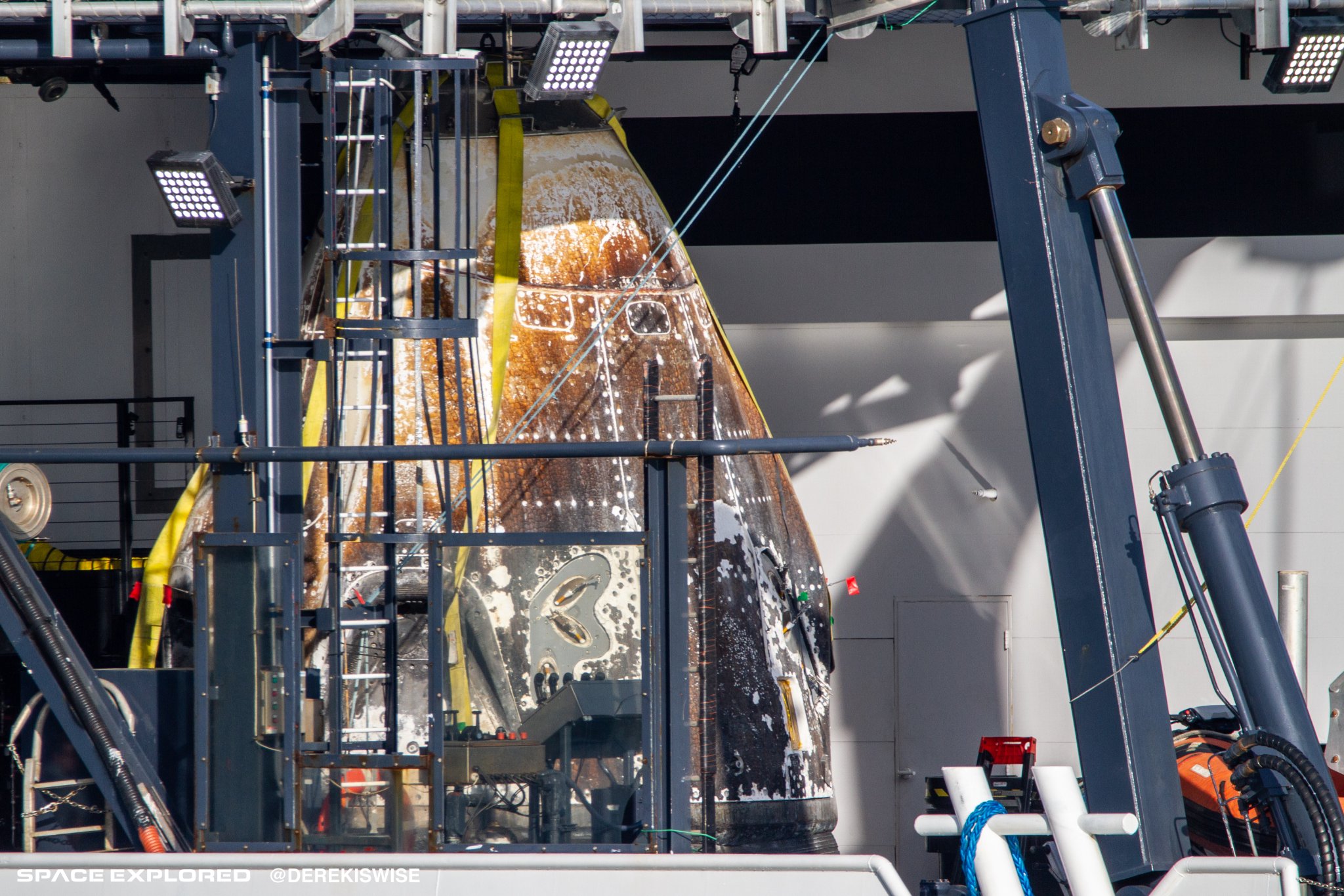 Die Fußstützen werden nach der Landung ausgebaut, damit mehr Platz für die Helfer beim Aussteigen ist. Im Landevideo ist zu sehen, dass zunächst die erste Fußstütze aus der Kapsel gereicht wird, und erst danach in die Kapsel hineinfotografiert und -gefilmt wird.