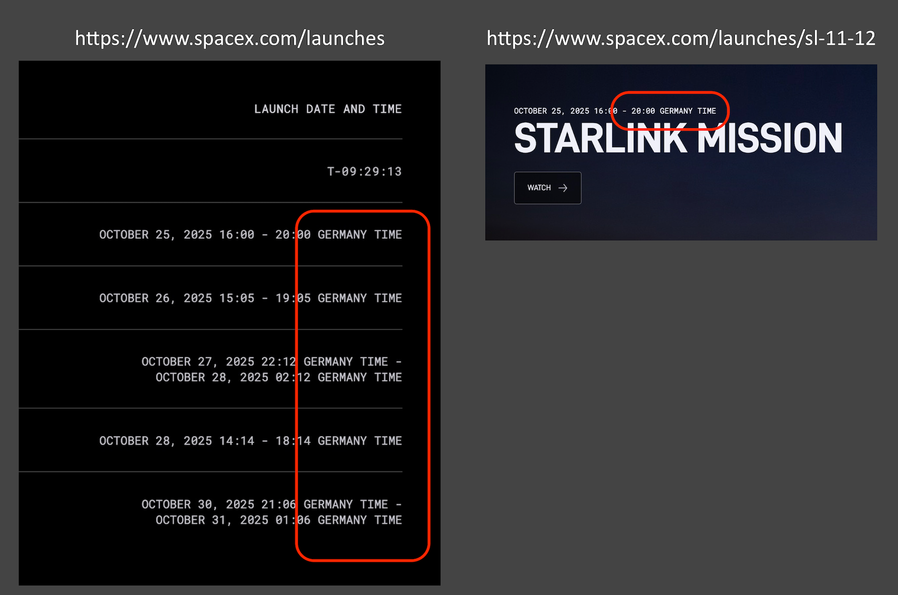 Auf der SpaceX-Seite steht aktuell immer noch: October 22, 2025 21:30 Germany Time