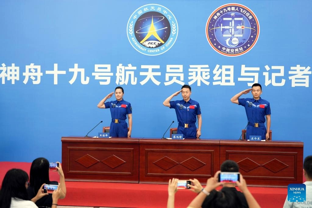 Die chinesischen Taikonauten Wang Haoze, Cai Xuzhe und Sung Lindong traten nach ihrer Reha  am Mittwoch, dem 9. Juli, erstmals öffentlich auf und berichteten den Medien über ihre Arbeit und Eindrücke während ihres Raumflugs im Erdorbit.