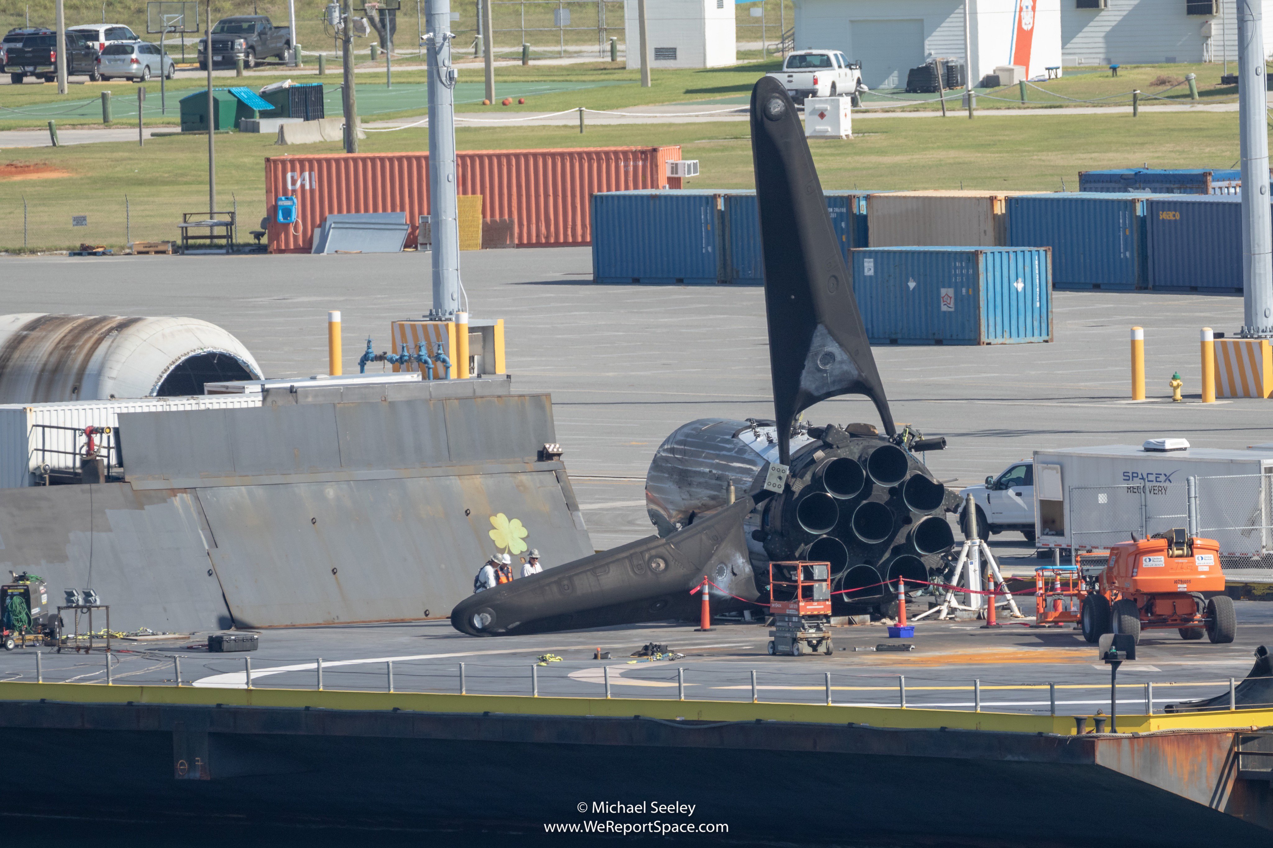 Die Gridfins sind ziemlich groß und schwer, die trägt man nicht eben mal per Hand übers Deck. Irgendwo ein Kran mit passendem Ladegeschirr in der Nähe?