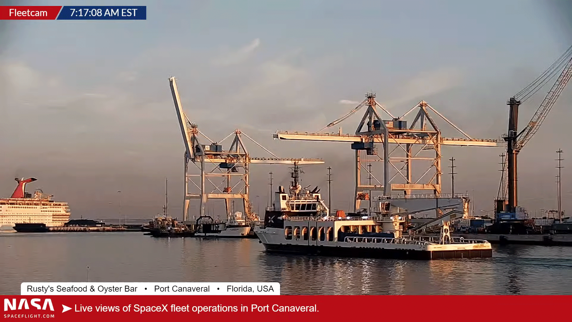Das SpaceX Mehrzweckschiff Bob ist heute mit 2 intakten Verkleidungshälften wieder im Hafen von Port Canaveral eingelaufen.