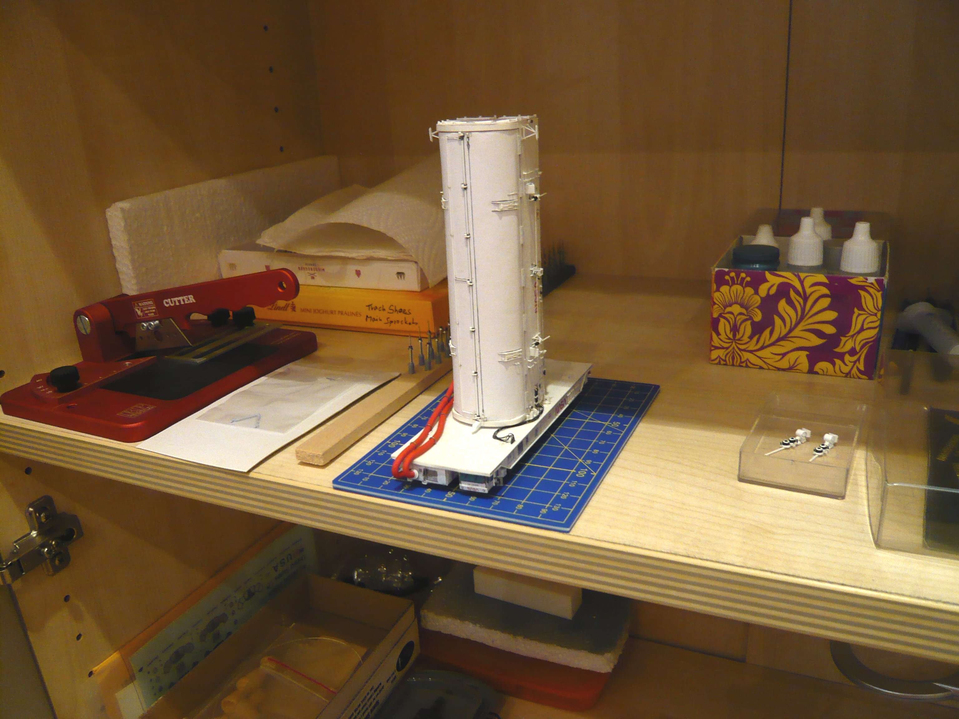 In der endgültigen Lösung wird die Strombank um 90° gedreht und ausziehbar unter der Diorama-Grundplatte montiert, was aus dem folgenden Bild ersichtlich ist.