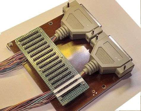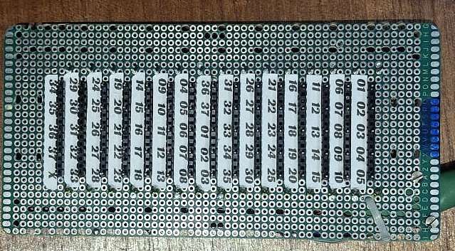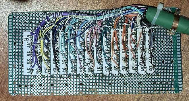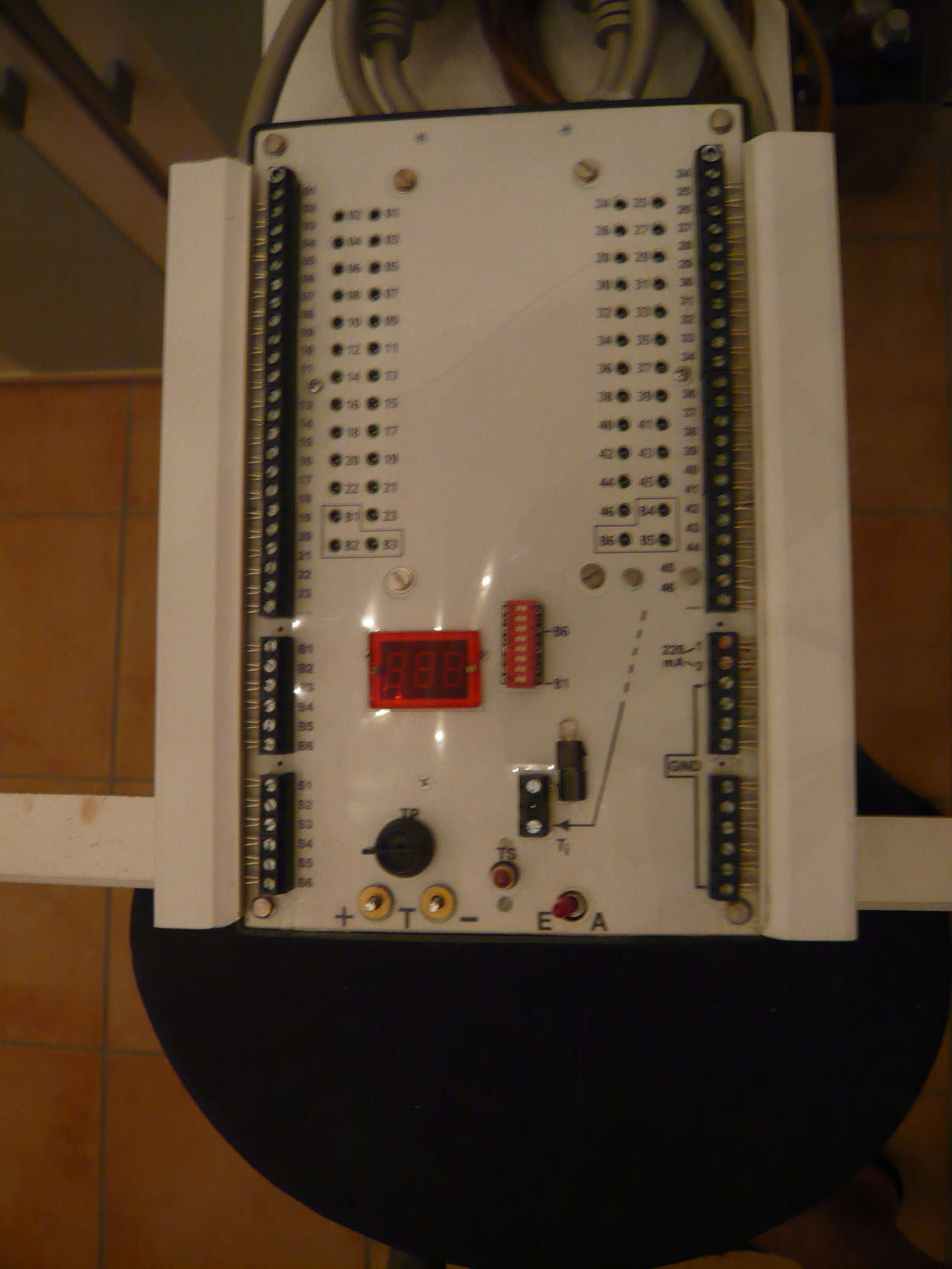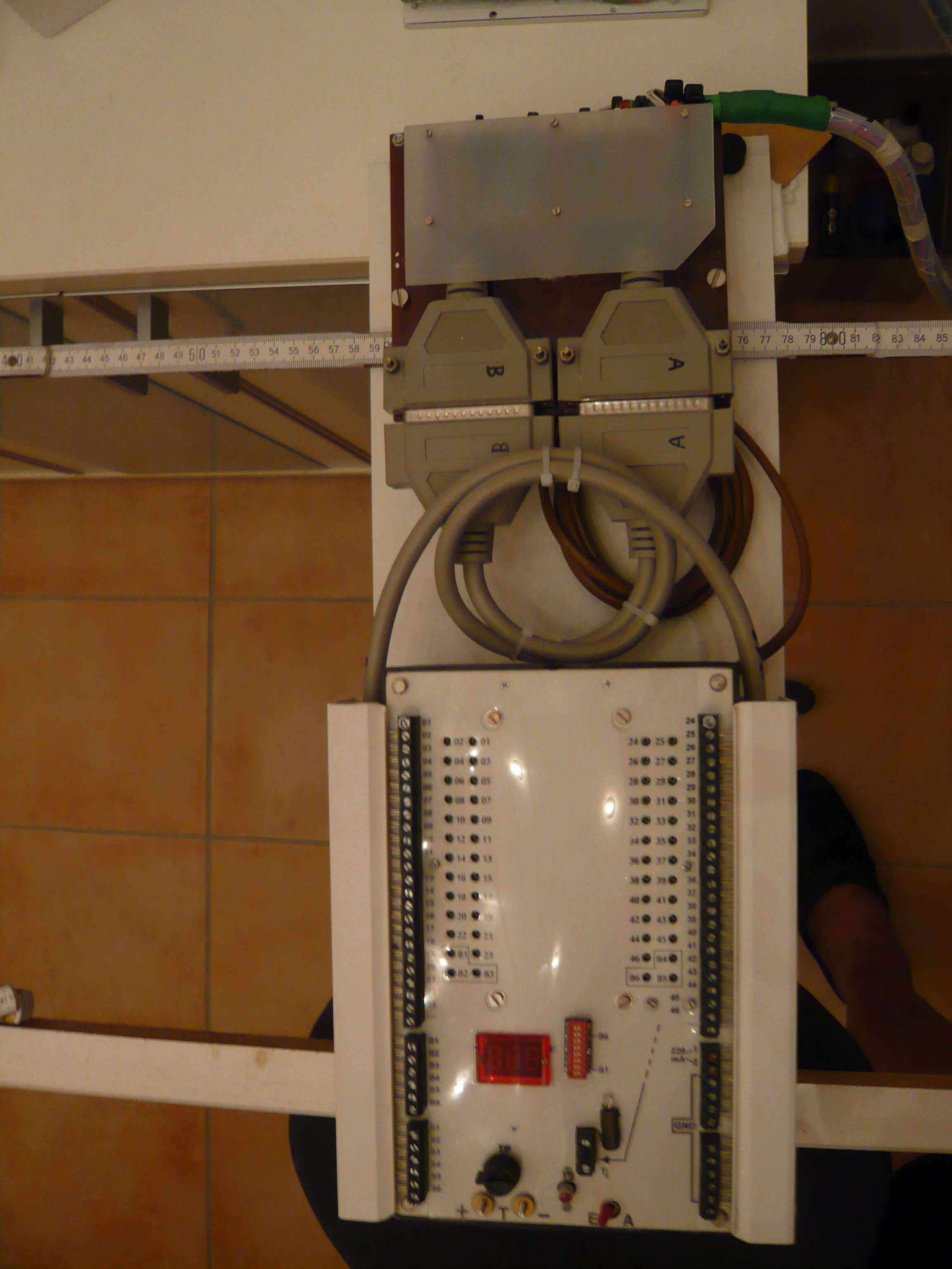 Deshalb hat mein Freund Arno noch einmal viel Geist und Arbeit investiert und zunächst eine Anschlussplatte vorbereitet und direkt hinter der Strombank montiert, deren 5 x 15 Kontaktstifte mittels der beiden Verbindungsstecker mit denen der Strombank verbunden werden, deren Oberseite man hier sehen kann.