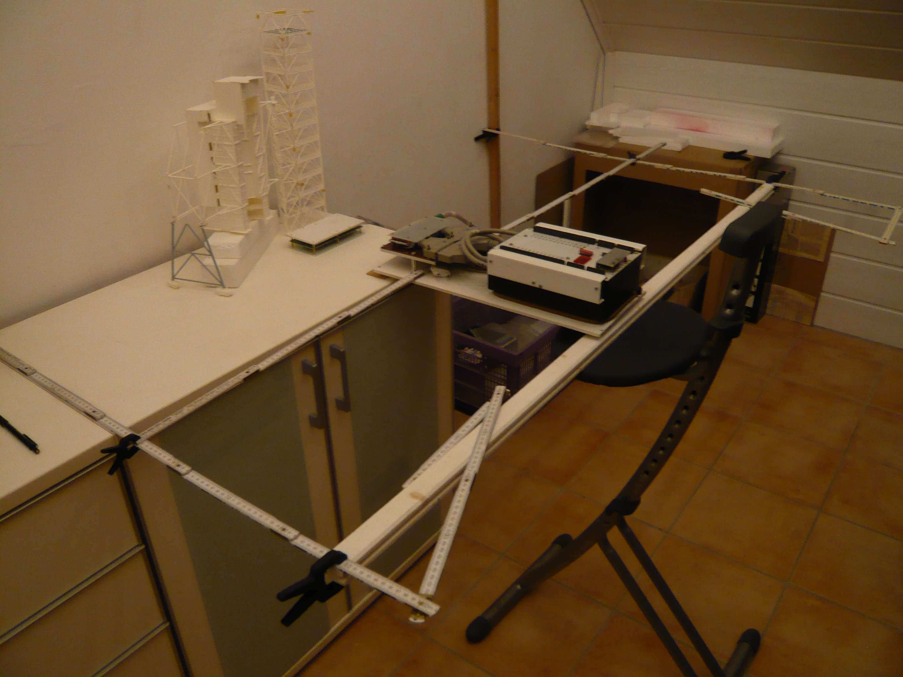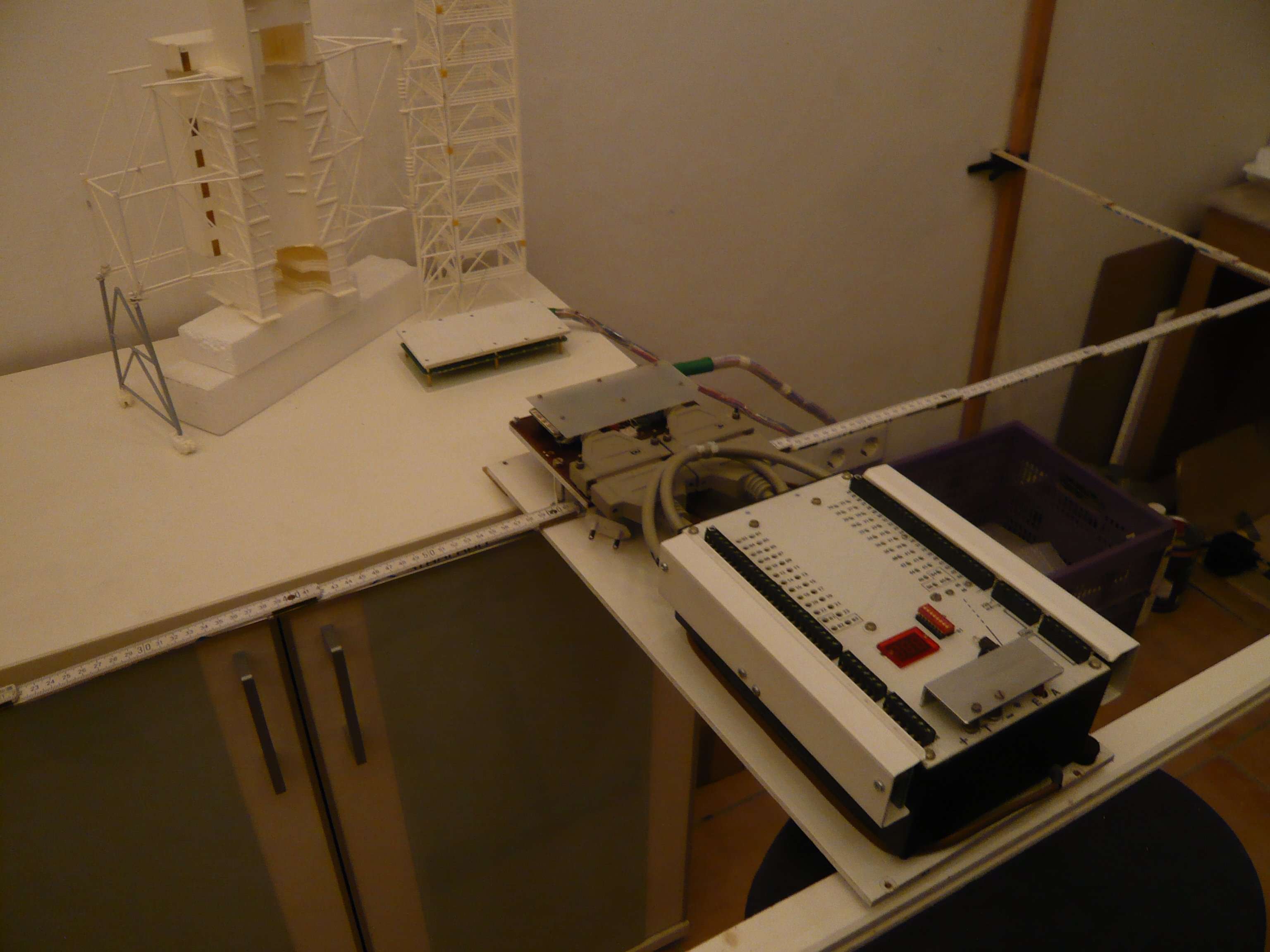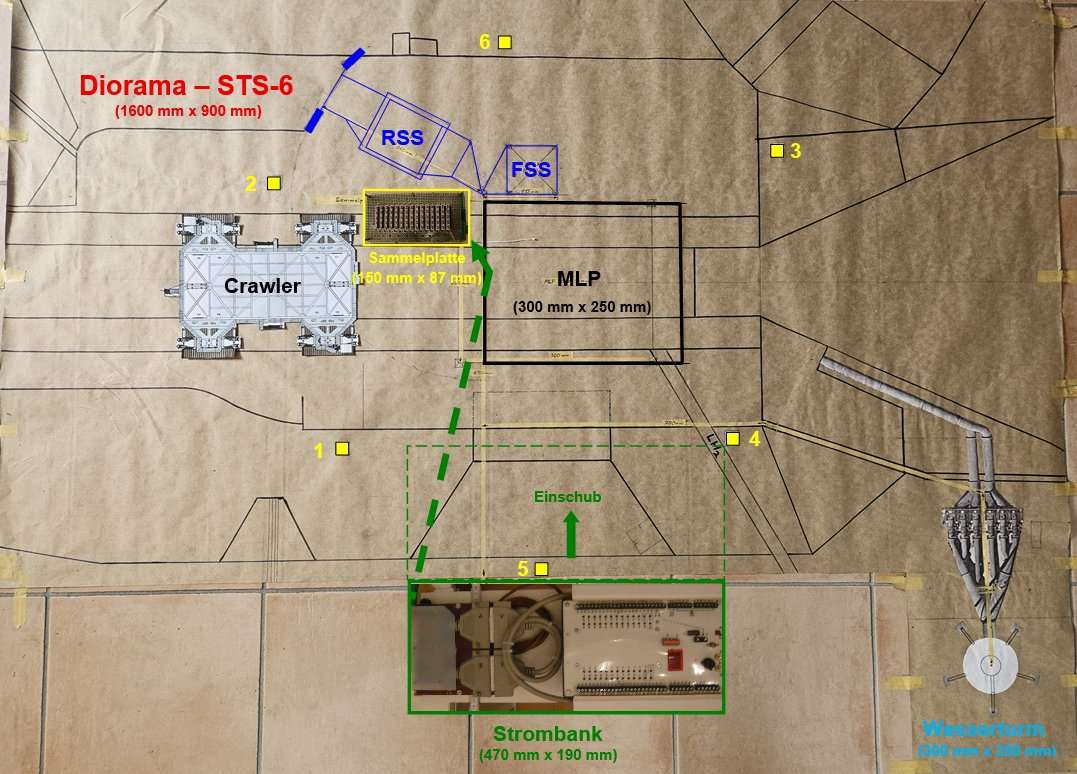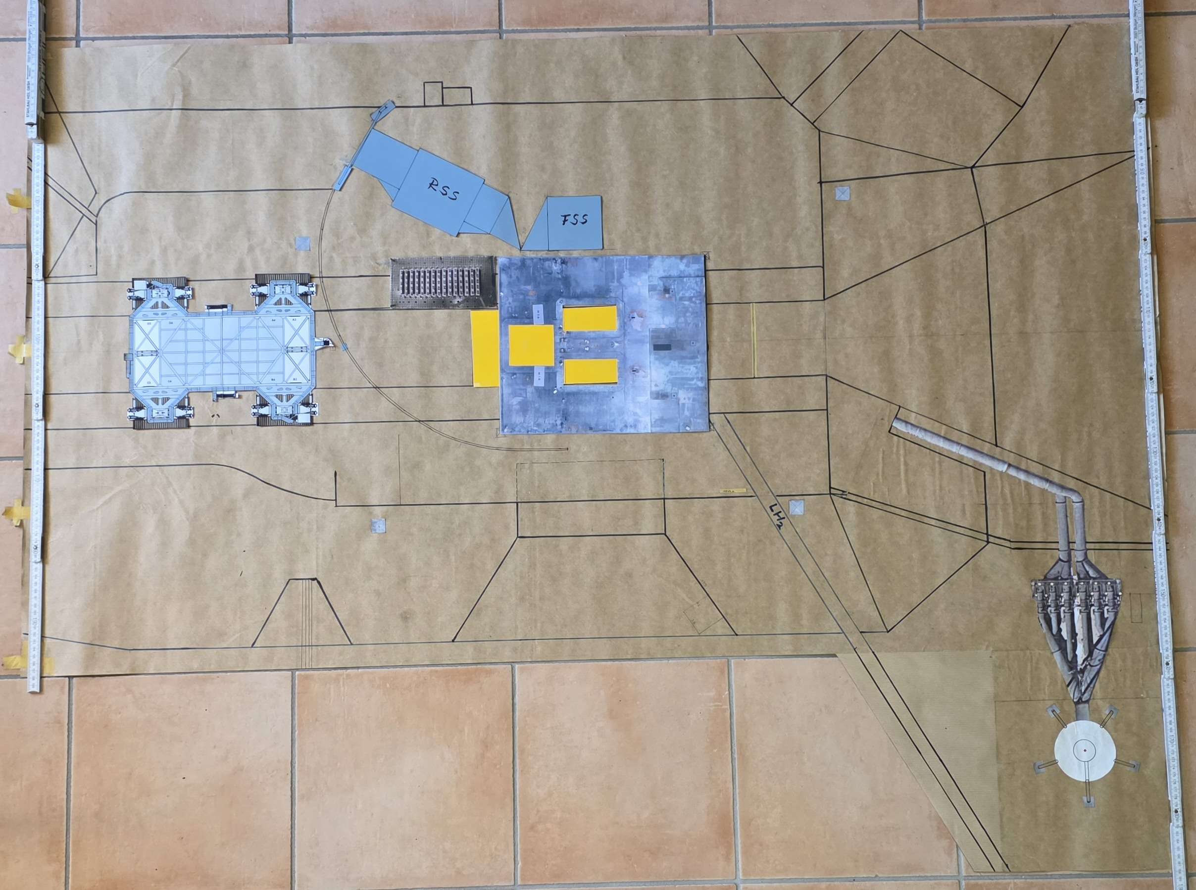 Um selber eine bessere Vorstellung vom späteren Standort des Dioramas zu erhalten, habe ich dessen Umriss (160 cm x 90 cm) im dafür vorgesehenen Raum mit mehreren Zollstöcken angedeutet und dazu sowohl die Rohbauten der FSS und RSS als auch die modifizierte Multi-Strombank provisorisch aufgestellt, wie man hier sehen kann.