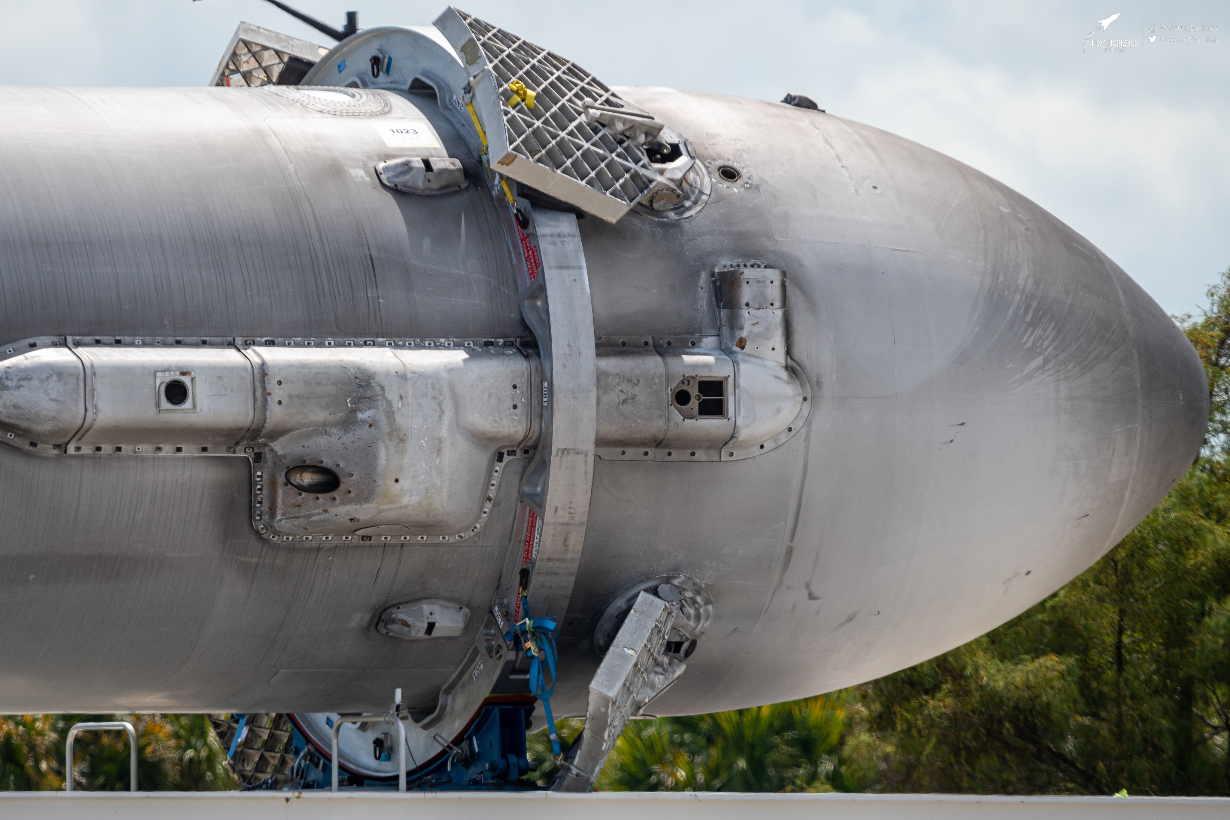 Seit B1046 gibt es nur noch Block 5 Booster. Da diese Seitenbooster schon zweimal gelandet sind, hatten sie auch Gridfins. Es gibt die Möglichkeit, dass dieser Booster nach seinem Start "endgültig verbraucht" werden soll. Dem widerspricht allerdings das Vorhandensein der Landebeine. Deshalb kann man meiner Meinung nach davon ausgehen, dass die Gridfins nachträglich montiert werden.