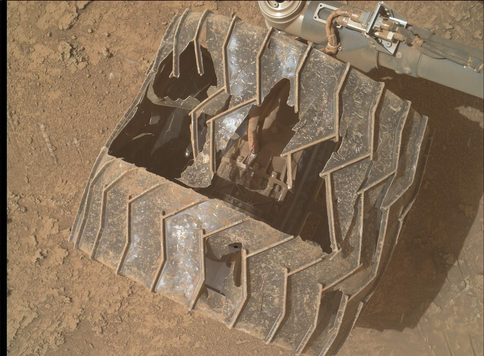 Am 23. März 2026 (Sol 4833) hat MAHLI mehrere Bilder der Rover-Räder aufgenommen. Dieses hier sieht besonders verheerend aus.