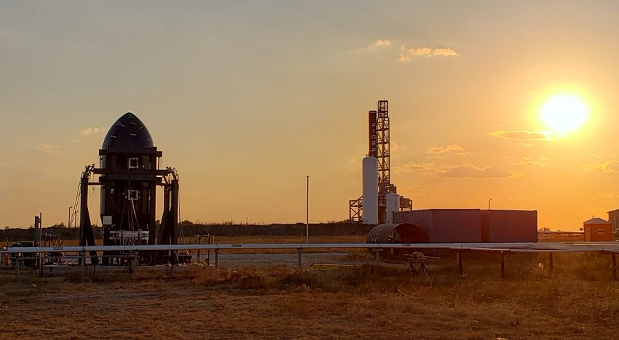 Auf ihrem Testgelände gibt es zudem mittlerweile einen Teststand für die Nutzlastverkleidung, auf dem nachfolgenden Bild mit einem Entwicklungs-Fairing zu sehen: