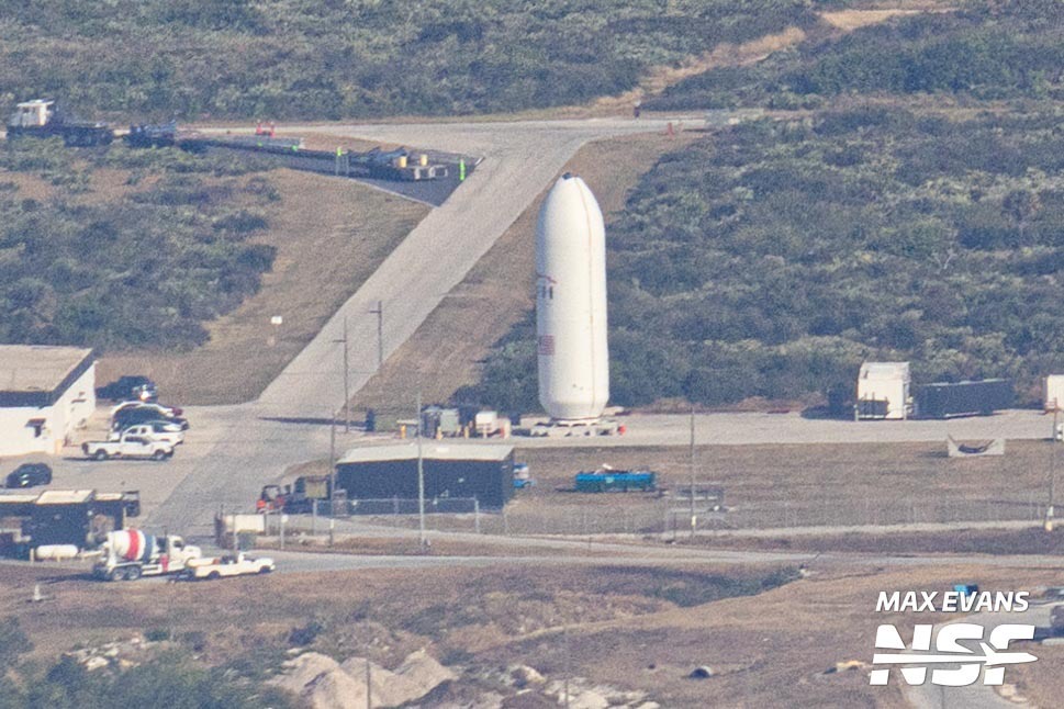 Lange erwartet, lange angekündigt, endlich ist es da: das erste größere Fairing für die Falcon-Heavy. Abmaße kann man im Moment nur schätzen. Durchmesser düfte mit altem F. identisch sein, Länge unbekannt. Bild aufgenommen vor wenigen Tagen bei einem Überflug.