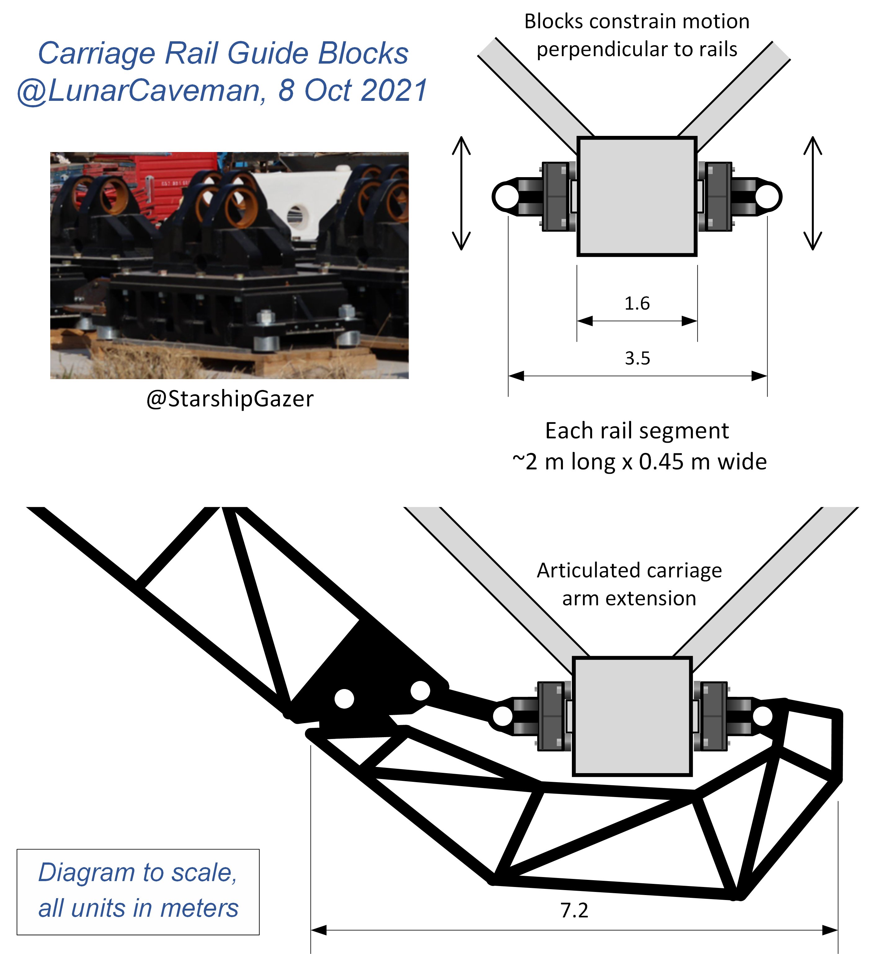 Der Schlitten muss die Fangarme ja "nur" stabilisieren. Die Fangarme selbst müssen jedoch das gesamte Gewicht des Boosters bei der Landung tragen. Das muss der Schlitten nicht, denn wie man an der Zeichnung sehen kann, hängt das Ganze ja an einem Seil welches zum Motor/Bremse geht. Sprich: Die Kräfte werden über die Fangarme in das Seil geleitet. Der Schlitten wird somit mit diesen Kräften nicht belastet.