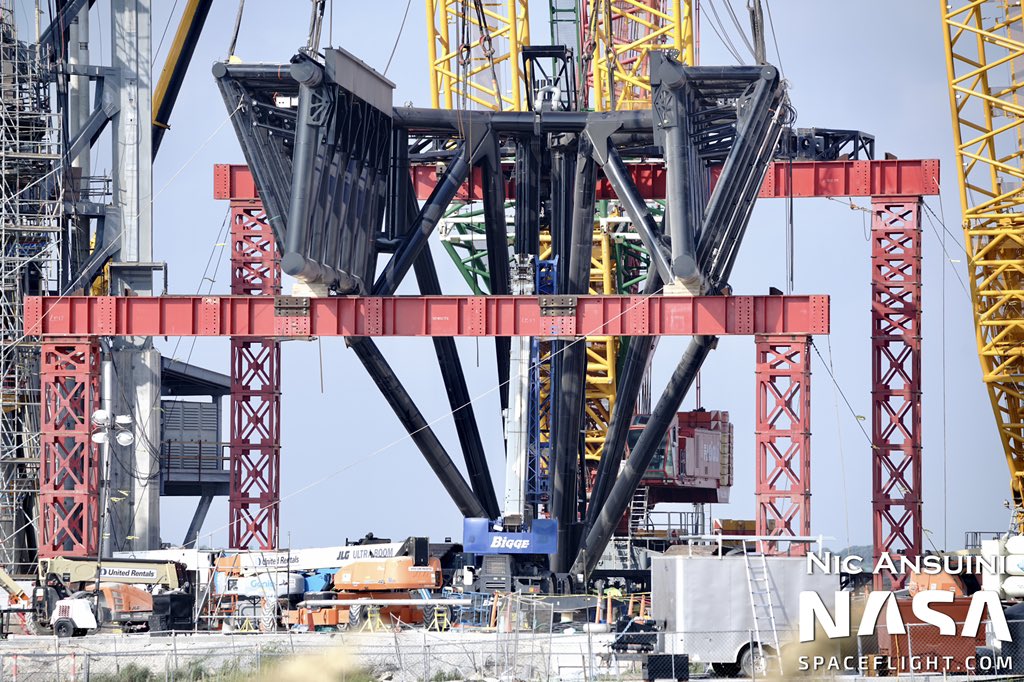 Man kann deutlich entspannter und schneller z.B. eine große Brücke einheben als sowas hier. Wie ich vermute wird der Liebherr LR 11000 von Buckner den zweiten Fangarm auf das Montagegestell heben um die Konstruktion komplettieren zu können, dann wird das ganze vermutlich mit beiden Kranen an den OLIT gesetzt, das wird noch viele, sehr viele Arbeitsstunden brauchen.