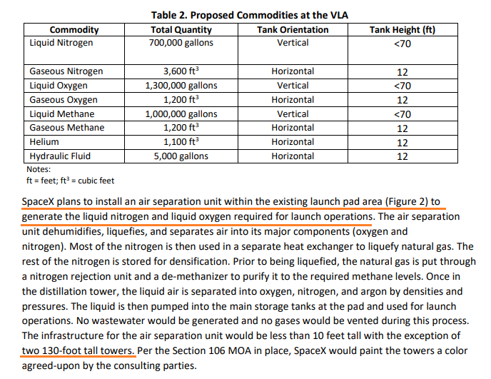 SpaceX plant, eine Luftzerlegungsanlage im existierenden Startgelände-Gebiet zu installieren (Grafik 2), um flüssigen Stickstoff und flüssigen Sauerstoff herzustellen, der für die Startoperationen erforerlich ist. Die Lufzerlegung entfeuchtet, verflüssigt und trennt Luft in seine Huaptbestandteile (Stickstoff und Sauerstoff). Der meiste Stickstoff wird dann in einem davon getrennten Wärmetauscher benutzt, um Erdgas zu verflüssigen. Der restliche Stickstoff wird zur Verdichtung gespeichert. Vor der Verflüssigung wird das Erdgas durch eine Stickstoff-Abtrennungs-Einheit, sowie einen Entmethanisierer geleitet, um es auf den Erforderlichen Reinheitsgrad von Methan zu reinigen. Sobald sie in dem Destillationsturm ist, wird die flüssige Luft in Sauerstoff, Stickstoff und Argon getrennt durch unterschiedliche Dichten und Drücke. Die Flüssigkeit wird dann in die Haupt-Lagertanks gepumpt und für Startoperationen benutzt. Kein Abwasser wird generiert und keine Gase abgelassen, während dieses Vorgangs. Die Infrastruktur für die Luftzerlegung wäre weniger als 10 Fuß (~3 Meter) hoch, mit Ausnahme von zwei 130 Fuß (~40 Meter) hohen Türmen. Nach Absatz 106 des existierenden MOA (Memorandum of Agreement), würde SpaceX die Türme in einer Farbe streichen, welcher die beratschlagenden Parteien zustimmen.