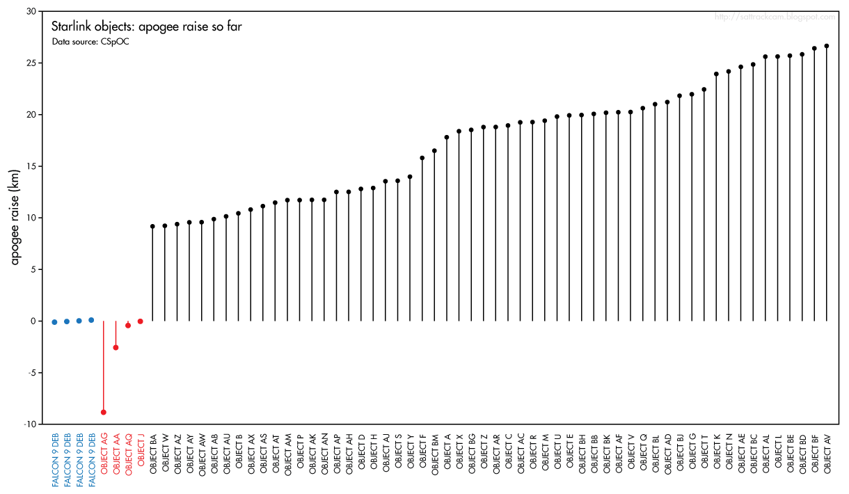 Die Satelliten J, AA, AG und AQ haben Ihre Bahn noch nicht angehoben. Ihre Triebwerke blieben bisher aus. Sie fliegen im Median auf einem Kurs von 449,5 zu 440,9 km. Satellit AA sinkt um 2,3 km pro Tag, bei gleich bleibender Sinkrate würde er in einem halben Jahr verglühen. Jedoch sind die Sinkraten immer schwankend, es könnte also auch 1 Jahr werden oder 1/4 Jahr.