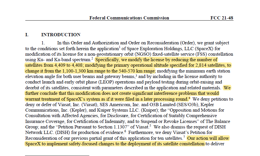 Wichtigster Satz (von Sheetz auch farblich hervorgehoben) meiner Meinung nach, der, laut dem die FCC zu dem Schluss kommt, dass durch das Absenken der Orbits keine bedeutenden Interferenzprobleme mit anderen Anbietern zu erwarten sind.