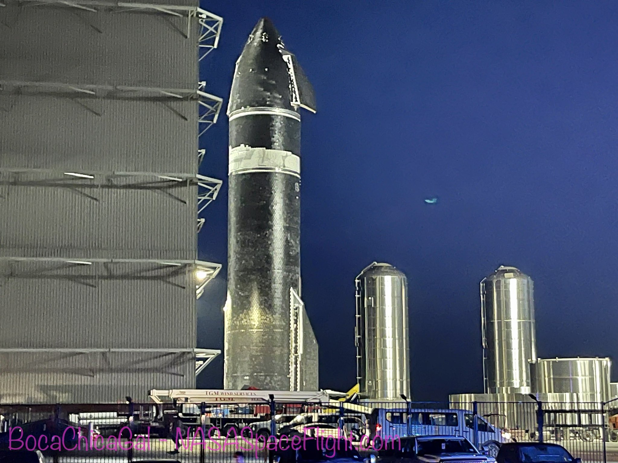 Es wird unter anderem vermutet, daß aktuell nur geguckt wird, ob alles auf dem Launch-Pad mit dem Booster passt. Danach wird er wieder zur Highbay gefahren, damit dort dann die Verkleidung unten um die Raptoren drankommt.