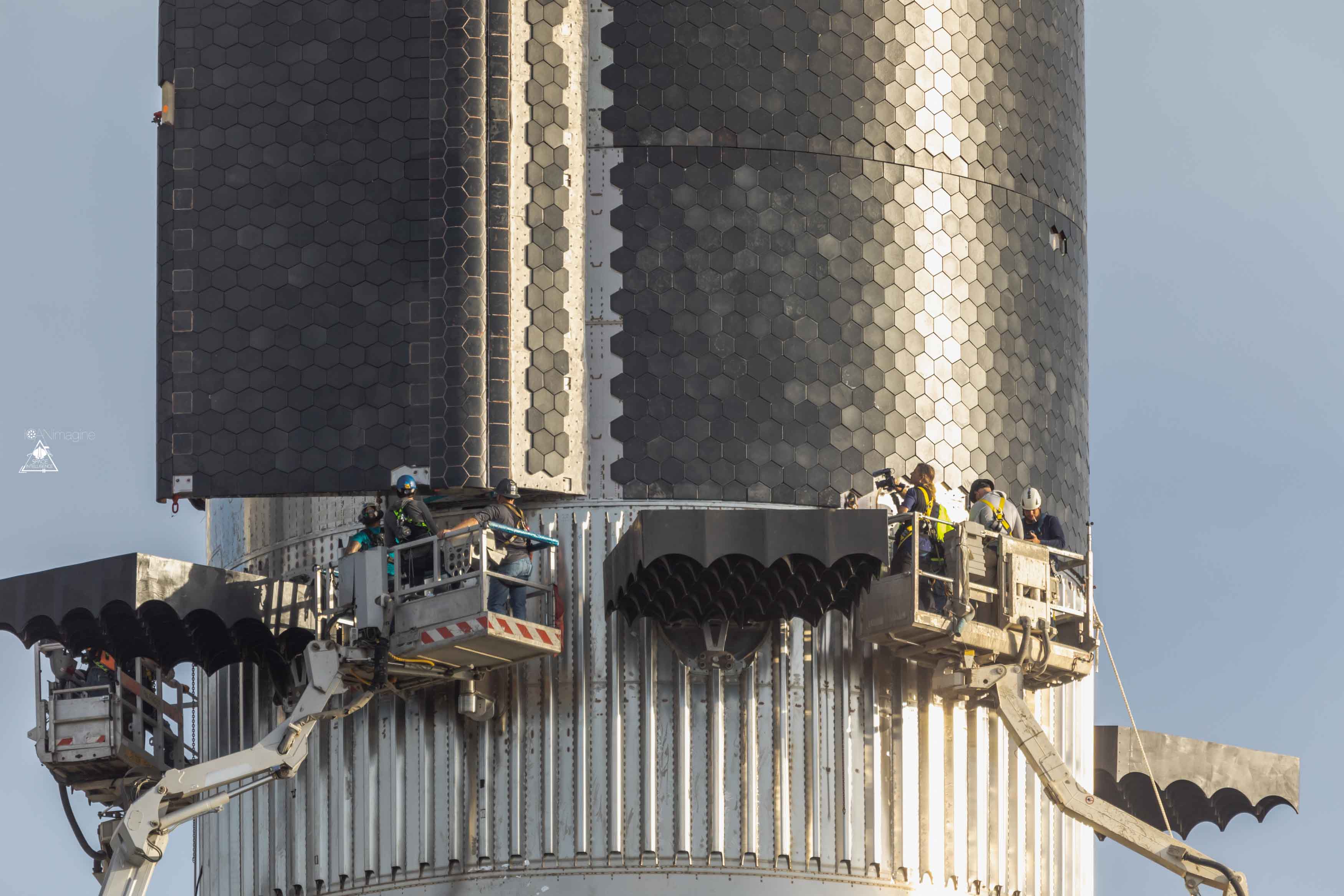 - das Stacking wird für den ersten Flug wahrscheinlich wieder per Liebherr-Kran gemacht, sie warten nicht darauf, daß der Launch-Tower-Kran fertig wird