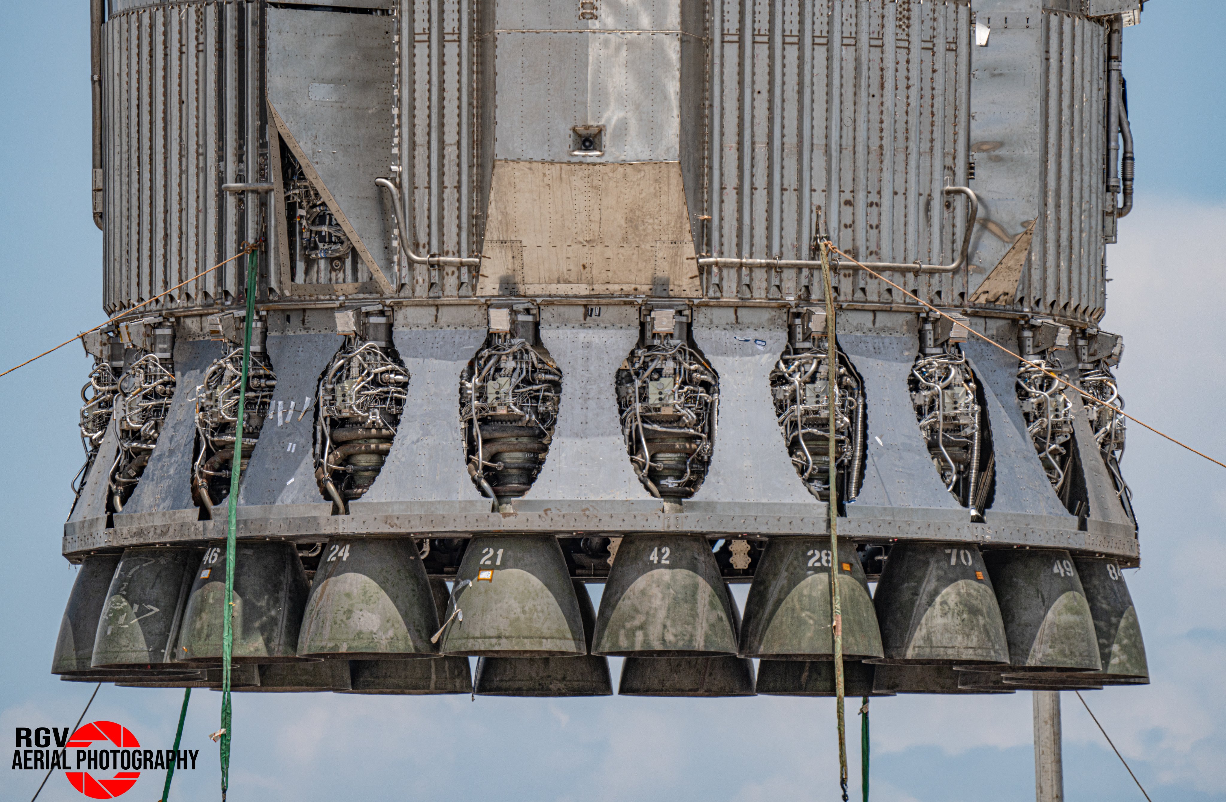 Die 33 Raptoren-2 mögen ja jetzt tatsächlich montiert sein, aber die individuelle Abdeckung der 20 äusseren Triebwerke fehlt nachwievor. Ich glaube nicht, daß so gestartet, geflogen und sicher gelandet wird.