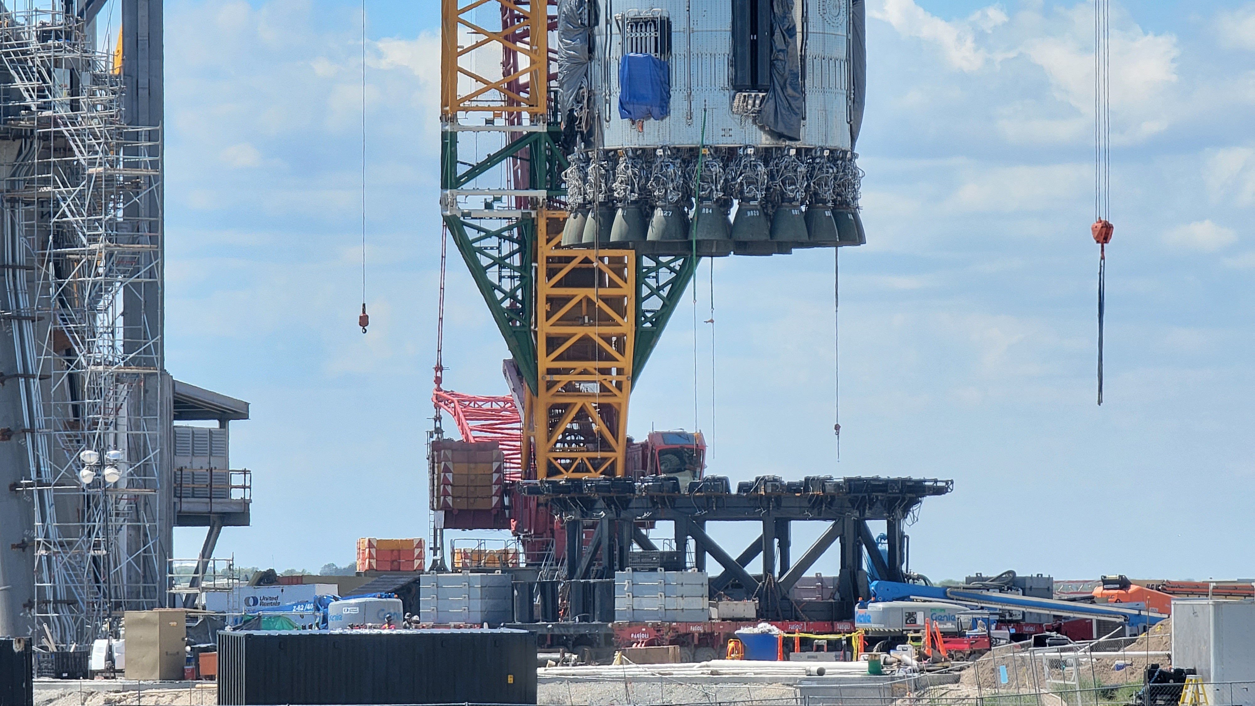 Nachdem vor wenigen Tagen ein 9er-Schubdom angeliefert wurde (wohl für B6), kam jetzt erstmals ein 13ner an für 33 Motoren insgesammt. Ob dieser schon für einen neuen Booster verwendet werden wird, oder für einen weiteren Testtank, ist noch nicht raus.