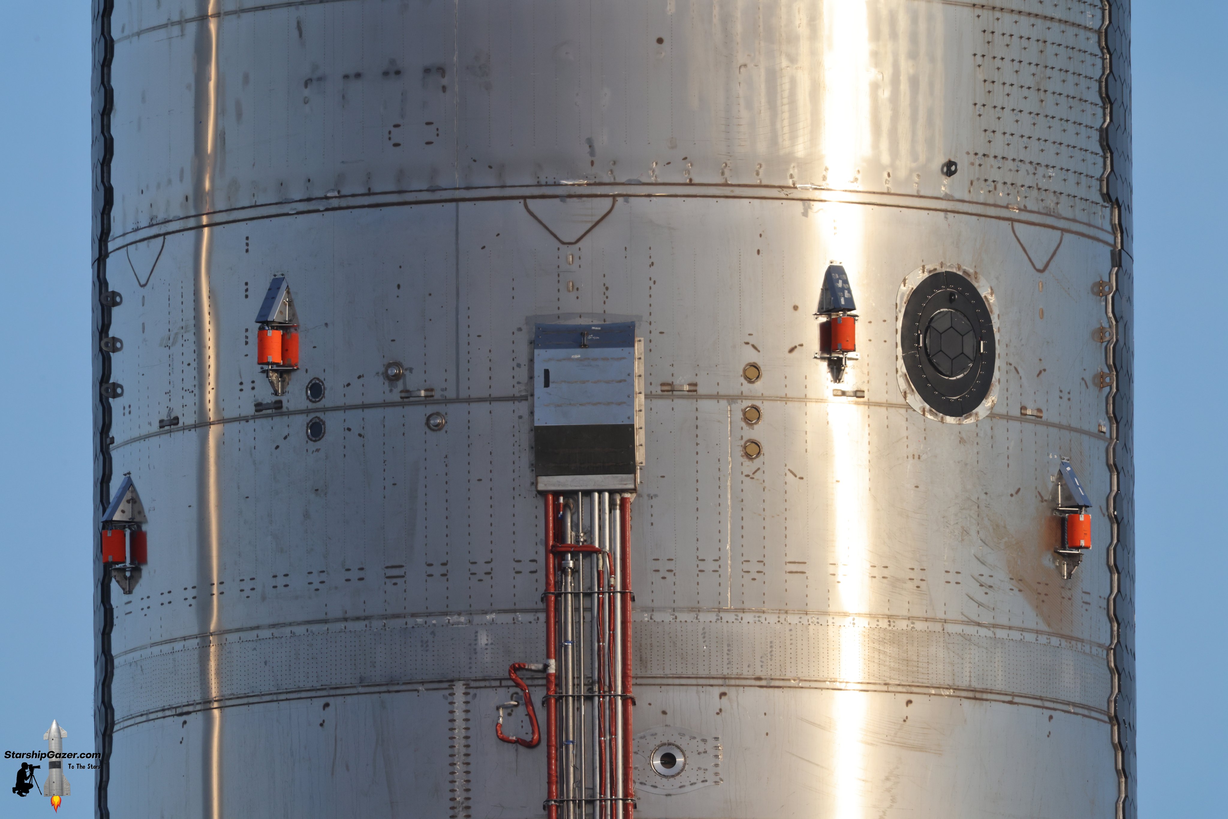 Wir hatten doch vor Kurzem über diese Verkleidung diskutiert. Einige waren der Meinung, die Raptoren werden ähnlich wie bei der F9 mit Blechen voneinander getrennt. Dieses Bild beweist, dass das nicht der Fall ist. Die Verkleidung soll offensichtlich alles bis auf die Düsen vor Hitze und Wind (beim Eintritt) schützen. Einen Schutz der Triebwerke voneinander gibt es (zumindest bei B4) nicht.