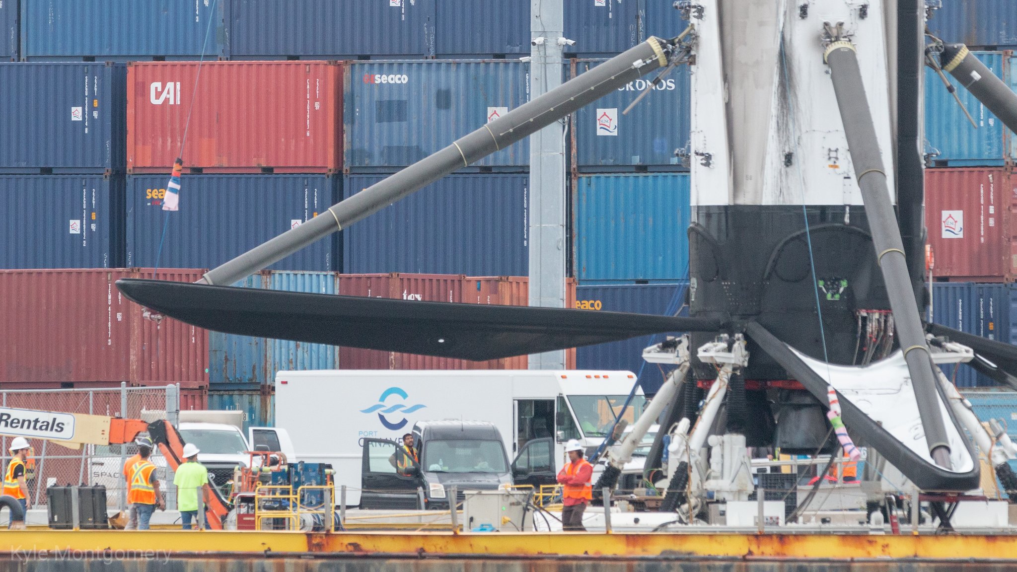 Wollte gerade das gleiche posten. Der Booster noch auf dem Droneship, gehalten vom Octograbber. Sie haben ihn sonst immer zuerst auf den Stand am Pier gehoben. Den brauchen sie dann gar nicht mehr. Sie sollten in der Lage sein, den Booster direkt auf den Transporter zu heben, wenn die Beine angelegt sind.