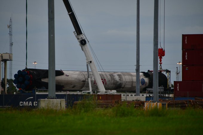 Was Interessantes passiert gerade in Port Canaveral. Der Booster B1058.1 und die neue Version des Octagrabbers machen es möglich das man die Landebeine ohne Kran wieder in die Startposition klappen kann.  :o