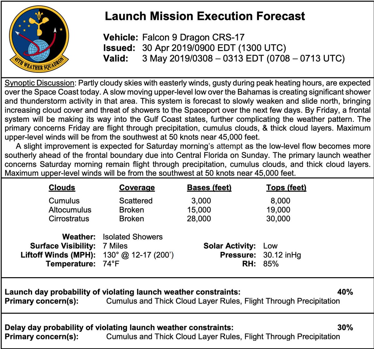 Der neueste Wetterbericht sagt für Freitag nur noch eine Chance von 40% für einen möglichen Start. Viel Regen und Gewitter werden angesagt. Für einen Versuch am Samstag gibt es eine Prognose von 70% für Go.