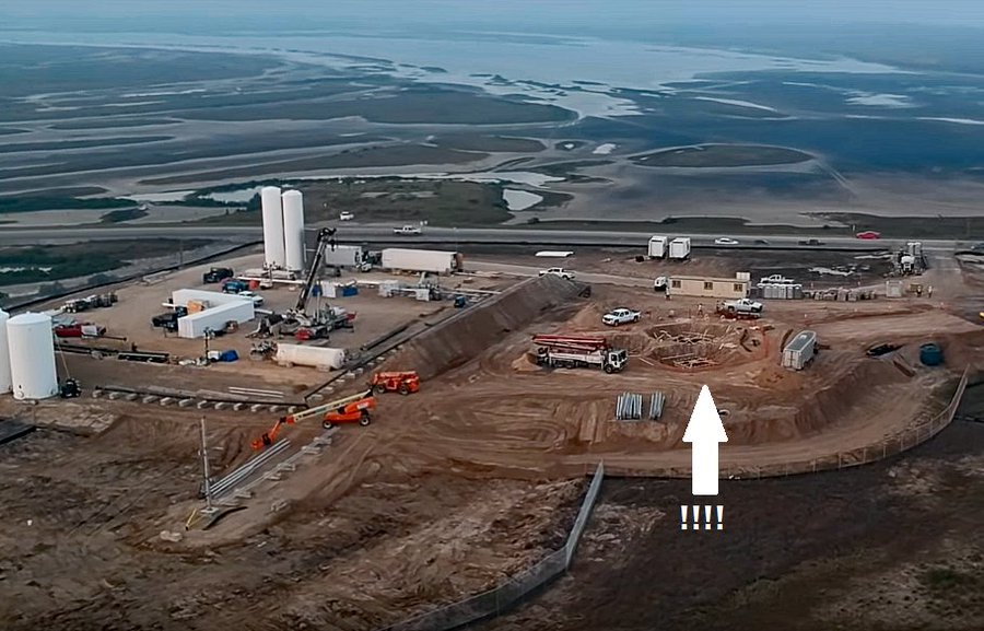 Auf dem neuesten Video vom Launch Pad sieht man bei Minute 3:00 drei riesige runde Fundamentlöcher hinter einem Schutzwall. Die Mittelpunkte der Aushubkegelstümpfe könnten die Entferungen zueinander haben, die den Abständen der "Raketenfüße" des Sternenschiffes entsprechen.