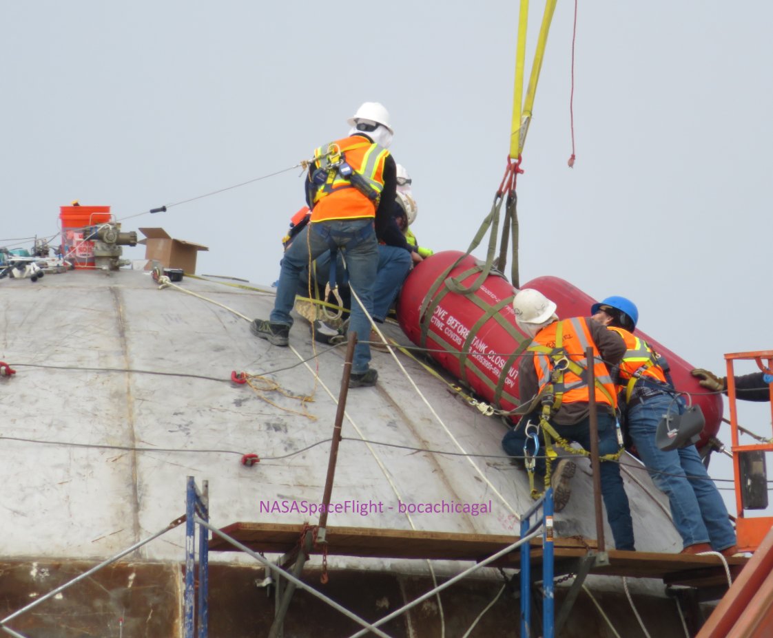 der Innenausbau vom Hopper scheint im Gang zu sein. Durch die Öffnung werden Faserverstärkte Drucktanks (Composite overwrapped pressure vessel - COPV) ins Innere gebracht.