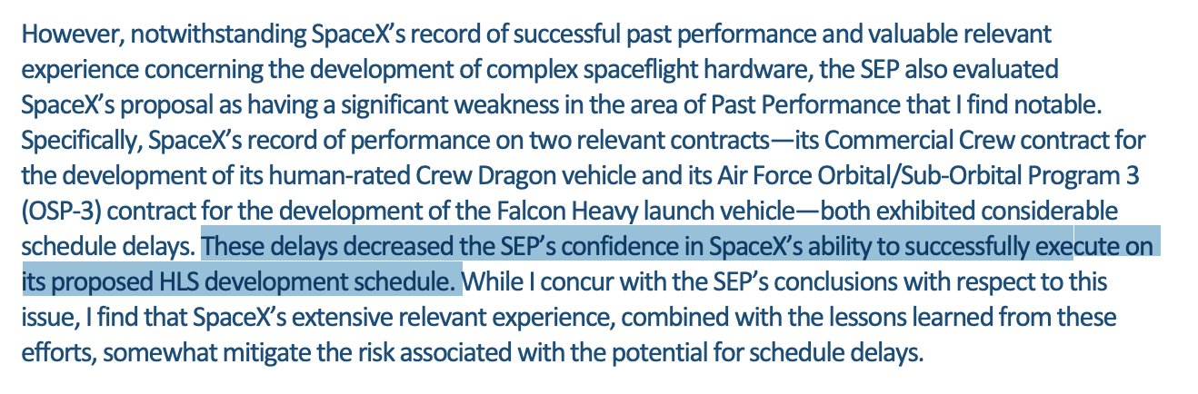“Second, SpaceX was evaluated by the SEP as having a significant weakness for its proposed overall architecture and concept of operations. Similar to the risks presented by SpaceX’s propulsion system, this aspect of SpaceX’s proposal presents other development schedule challenges (principally, those associated with its Starship variants and Super Heavy Booster), and requires numerous, highly complex launch, rendezvous, and fueling operations which all must succeed in quick succession in order to successfully execute on its approach.”