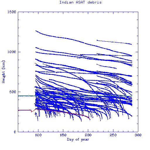 Man kann wohl mitnehmen, dass Zusammenstöße selbst in einem so tiefen Orbit (283km) noch Trümmer produzieren die 1-2 Jahre Jahre überleben. Das soll aber auch daran liegen, dass der Zielsatellit nicht frontal sondern von unten getroffen wurde..