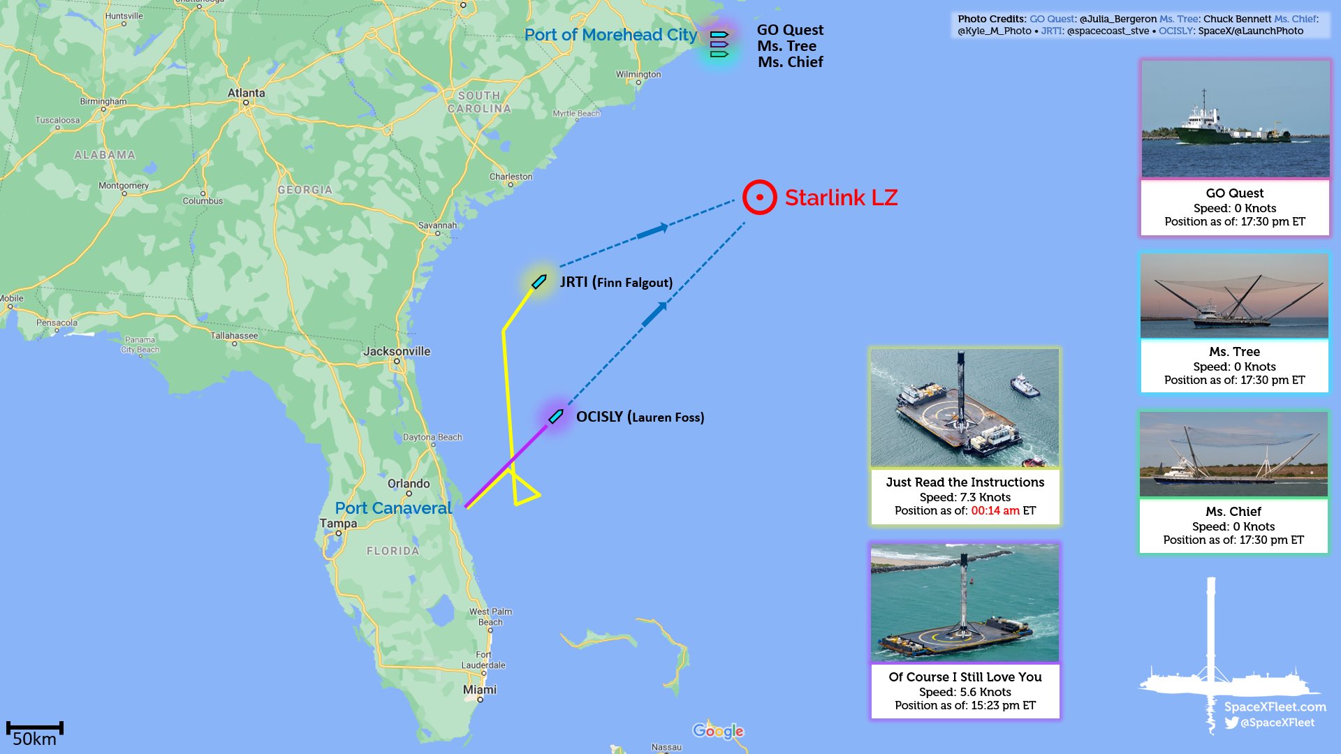 Mittlerweile hat JRTI wohl wieder umgedreht und ist wohl Richtung Landezone unterwegs. Gleichzeitig ist in Port Canaveral OCISLY ausgelaufen für die übernächste Starlink-Mission. Demnach lag wohl doch kein technischer Defekt an der JRTI-Plattform vor...