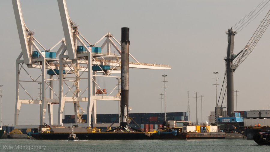 Die Erststufe von Starlink 7 ist in Cape Canaveral angekommen. Nachdem es sich anfangs fast nicht bewegt hat bei schlechtem Wetter hatte ich schon Angst, sie könnten es wieder verlieren. Aber der Octograbber hat es im Griff.