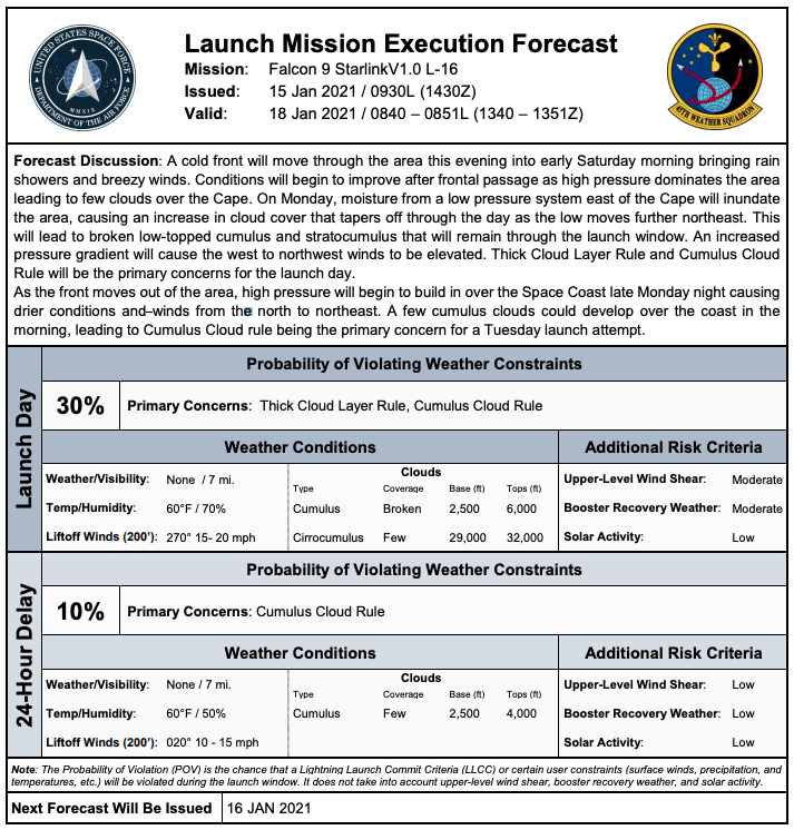 Der Start von Starlink-17 (L16 V1.0) ist für den 17. Januar angekündigt. Erstaunlicherweise auch auf SLC-40, auf dem drei Tage vorher Transporter-1 starten soll. Das würde für einen Start ohne Static Fire sprechen oder für eine spätere Änderung der Startrampe.