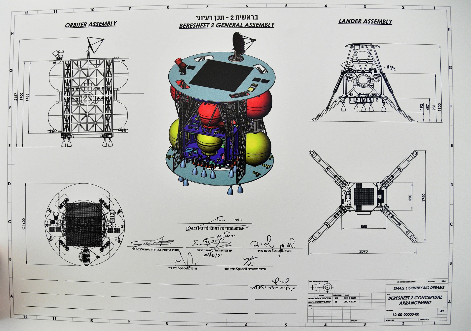 Meiner Meinung nach ist der groessere Lander auf dem Tisch nicht einer der beiden neuen Lander, sondern ein Model von Beresheet 1. Was wiederum auch nicht im richtigen Masstab ist. Laut Internetquellen hatte Beresheet 1 einen Durchmesser von 2m (mit ausgefahrenen Beinen) und eine Hoehe von 1,5m. Das stimmt nahezu mit den Massen aus der Zeichnung fuer die neuen Lander ueberein. Daher sieht man auch den groesseren Lander nicht in der Zeichnung.