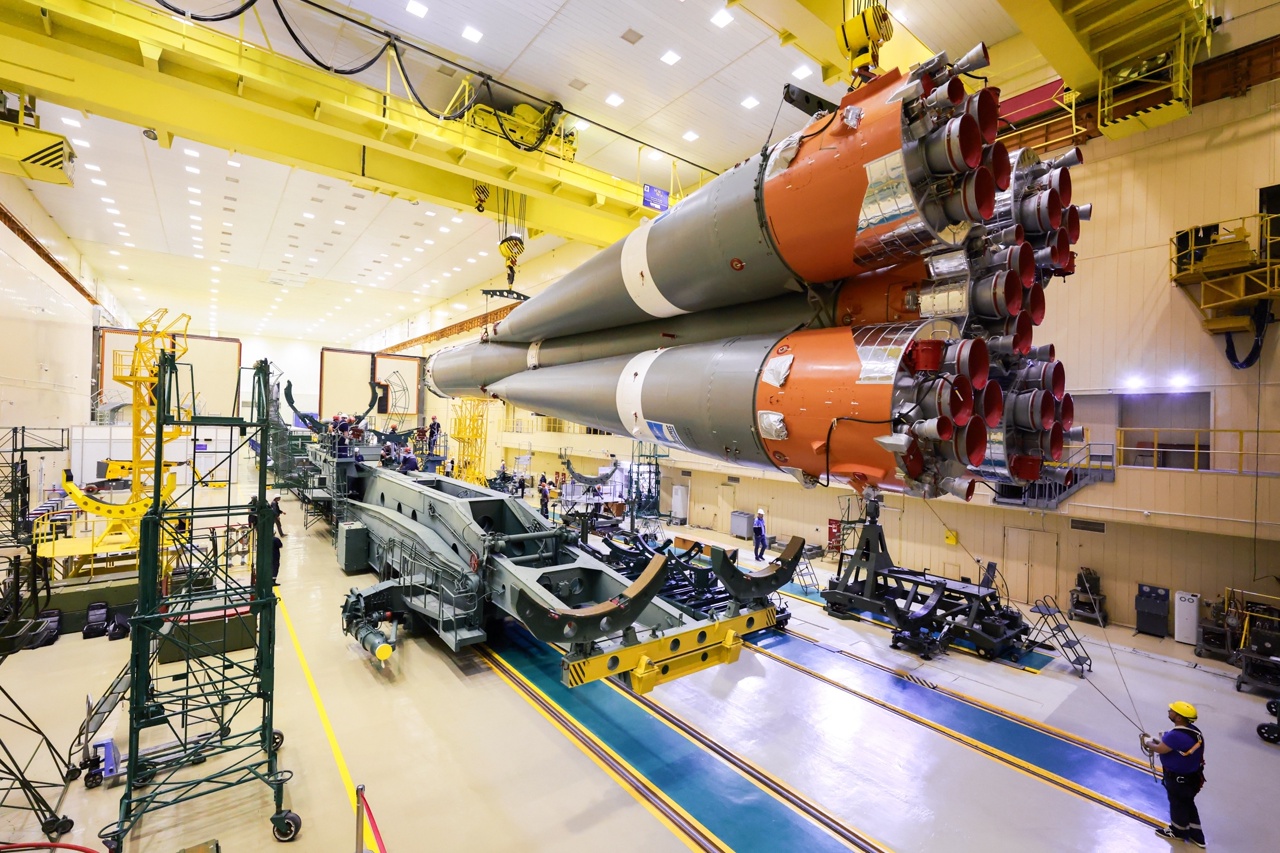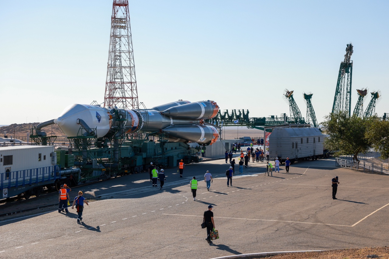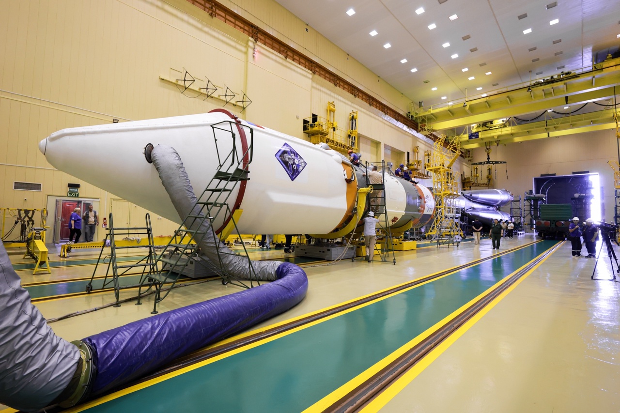 Gestern, am 19.08.2025, wurde im MIK-40 auf dem Pl.31, neben dem Startplatz, die Nutzlast, Bion-Nr.2 mit seiner Beschleunigungsstufe, an die 3. Stufe der Sojus montiert, anschließend erfolgte die Endmontage des"Pakets" auf dem Transport- und Aufricht-Aggregatewagen (TUA).