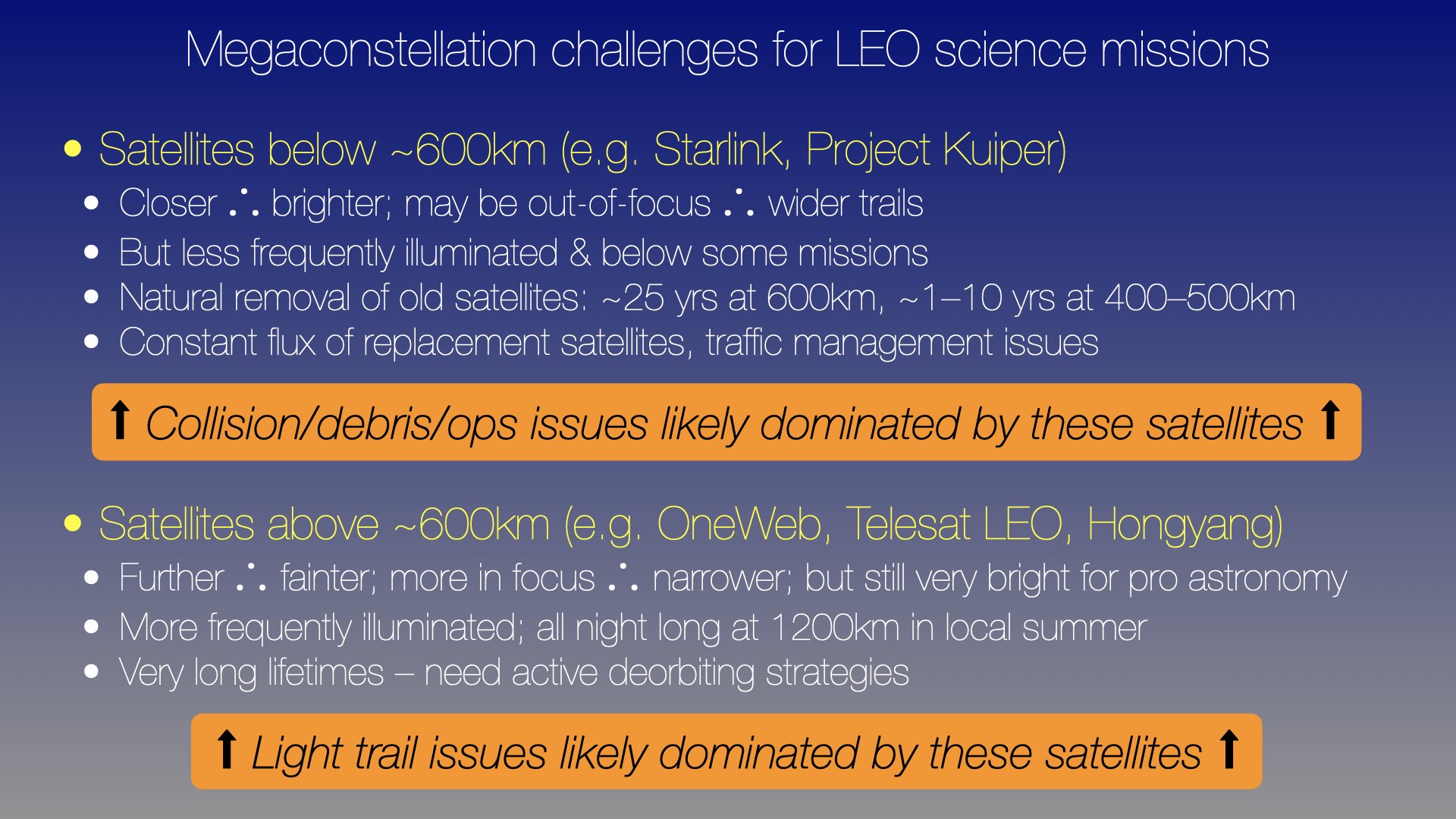 Stellen Sie sich das so vor, als würden Sie nachts plötzlich helle Lichter sehen, sie verringern Ihre Fähigkeit zu sehen, was um Sie herum ist, und Sie brauchen mehr Zeit, um sich darauf einzustellen, das heißt, wenn Sie sich überhaupt darauf einstellen können. Das ist bei einer Konstellation von ein paar tausend Satelliten der Fall, aber es gibt Pläne für bis zu 100.000 Satelliten im Orbit. Wenn das der Fall wäre, würden sie das Band komplett verlieren.