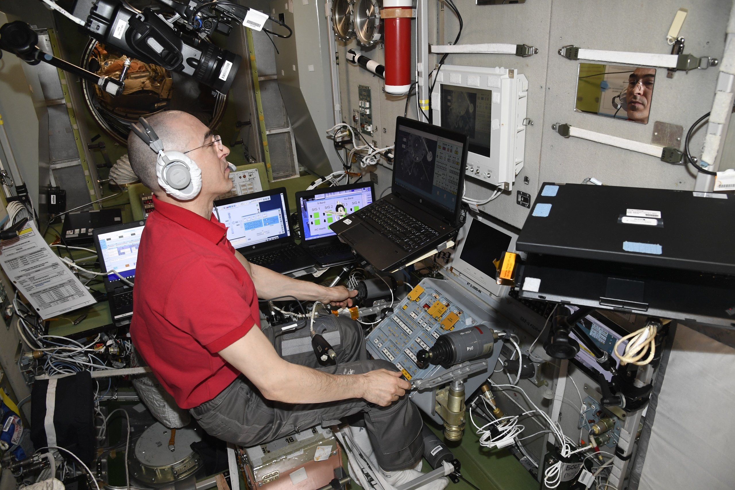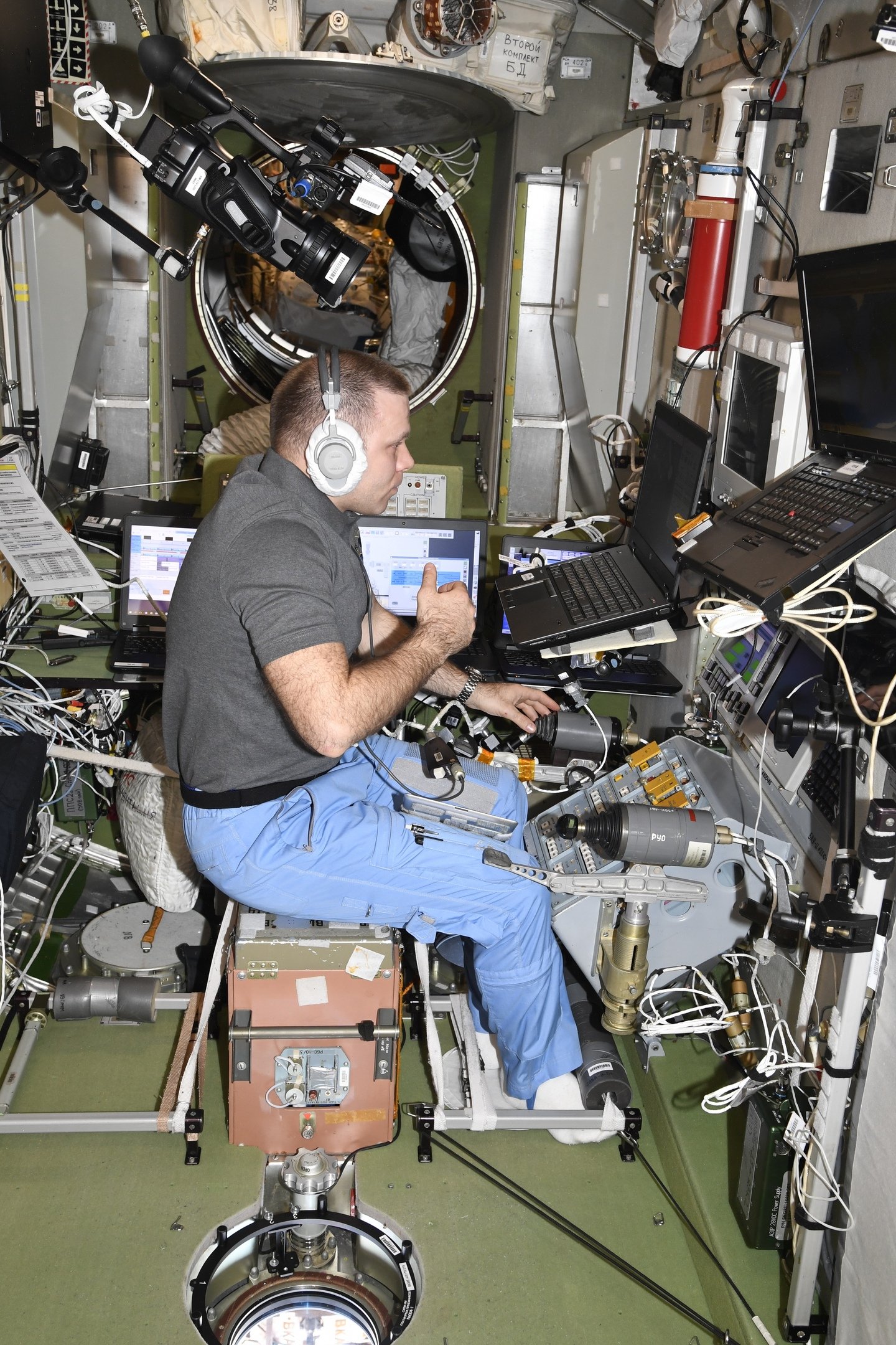 I. Wagner und A. Iwanischin haben sich vor dem Start von Progress MS-14 am Platz für die Handsteuerung bei der Annäherung und Kopplung (TORU) auf den Fall vorbereitet, dass einer von ihnen die Handsteuerung in dieser Phase übernehmen müssen.