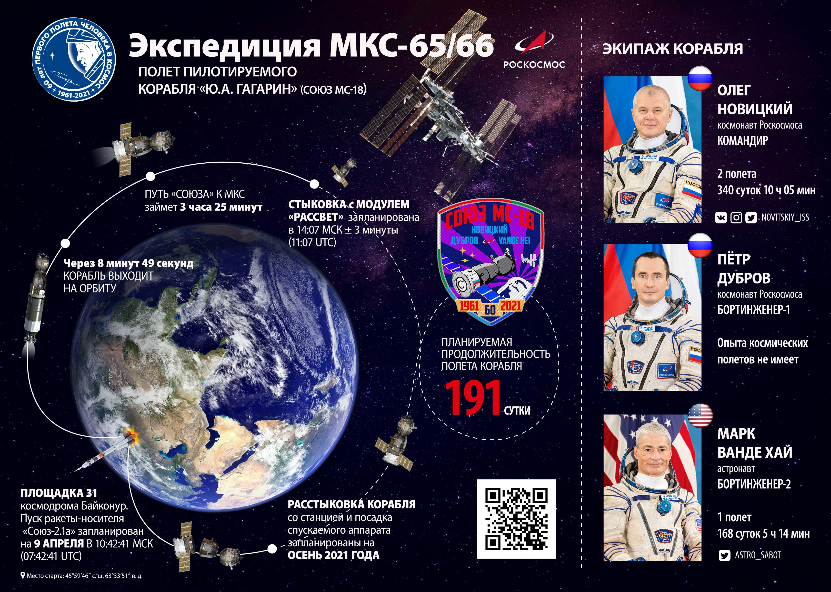 Am Freitag, 9. April 2021 um 09:42 Uhr deutscher Zeit hob das russische Raumschiff Sojus-MS 18 erfolgreich vom Weltraumbahnhof Baikonur in Kasachstan ab. An Bord befanden sich drei neue Besatzungsmitglieder für die ISS-Expedition 65. Die Kopplung mit der Internationalen Raumstation erfolgte lediglich dreieinhalb Stunden später um 13:05 Uhr deutscher Zeit. "
