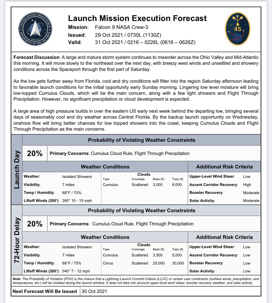 Die Mission #Crew3 ist jetzt für Mittwoch, den 3. November um 01:10 Uhr ET anvisiert, da ein großes Sturmsystem Wind und Wellen im Atlantik entlang der Flugroute von Crew Dragon das Risiko für den Startversuch am 31. Oktober erhöht.