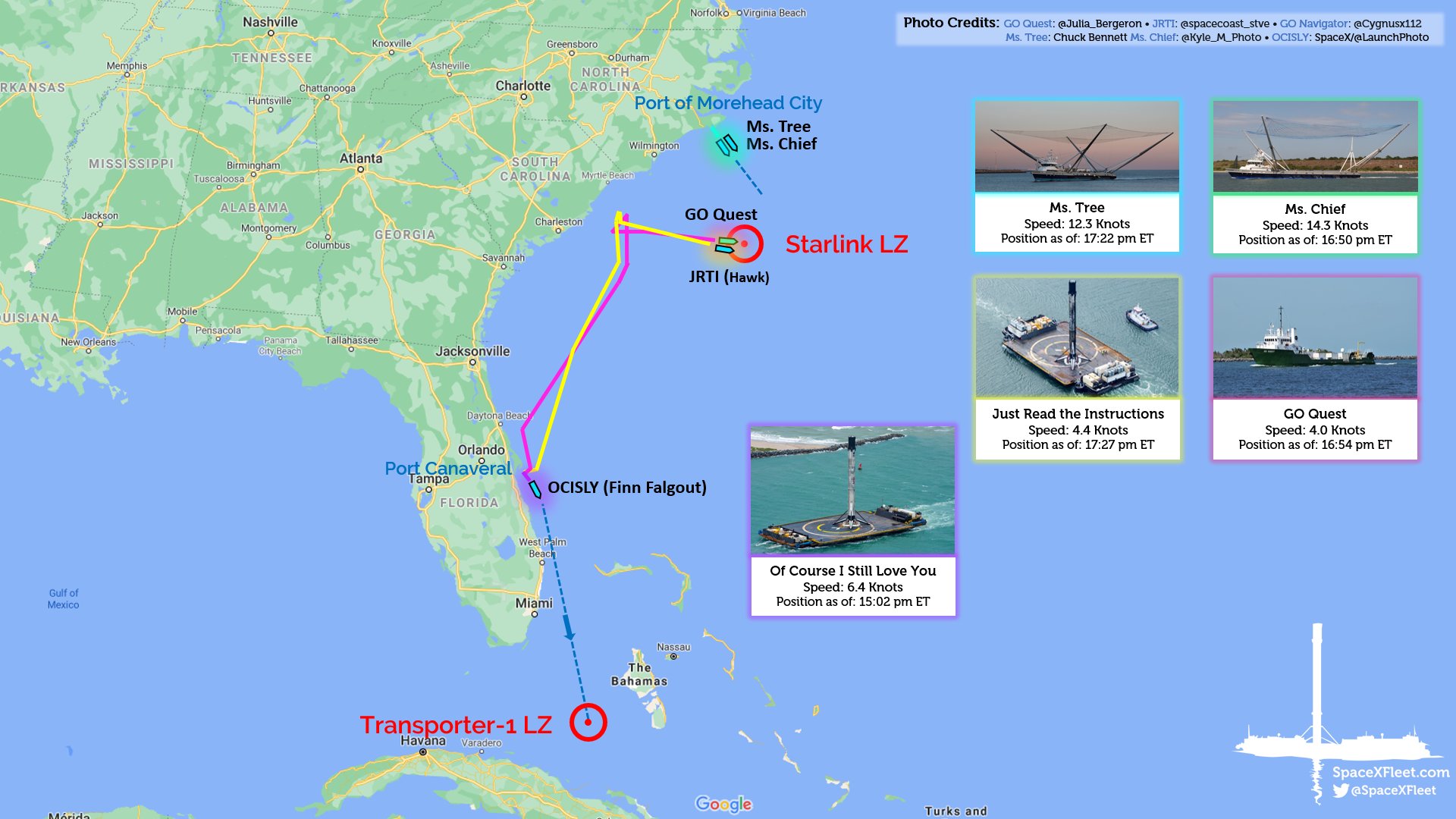 Das erste Mal wird das Drohnenschiff während der Transporter-1 Mission 556 km südlich von Cape Canaveral genau zwischen Kuba und den Bahamas stationiert. Es wird der 2.Flug von SpaceX in die polare Umlaufbahn von Florida.
