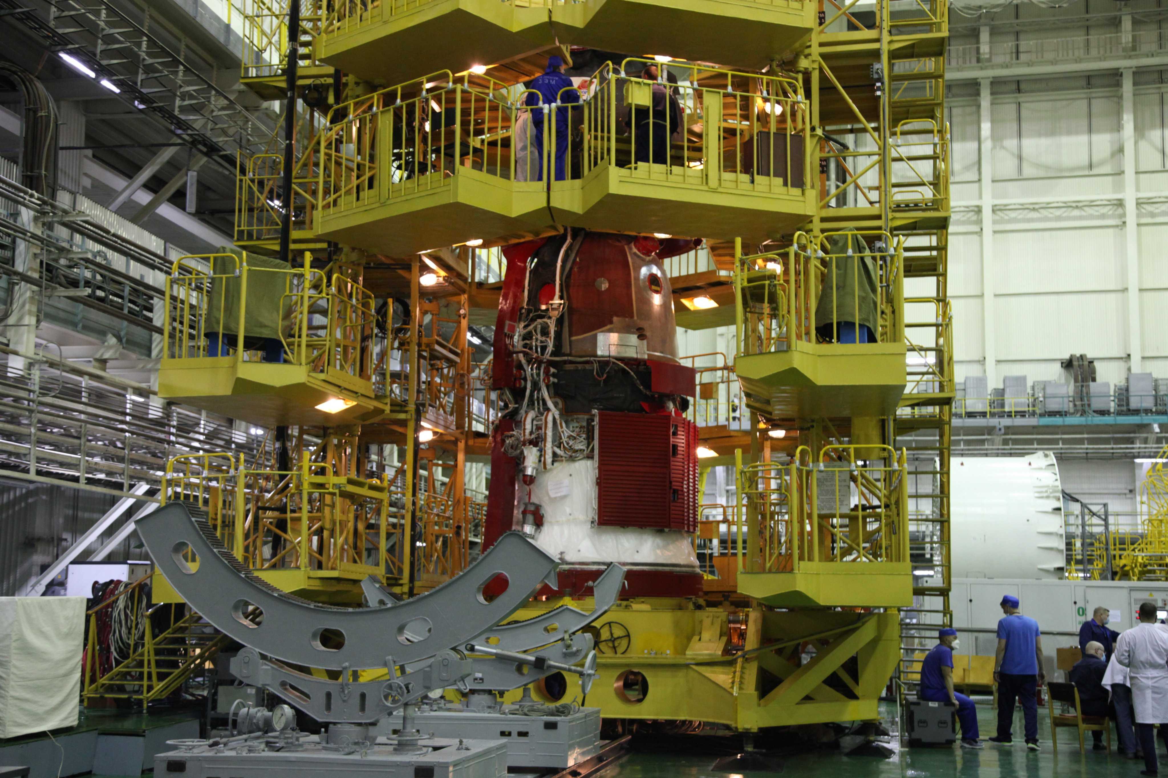 Sojus MS-20 wird aus dem Prüfstand bei Energia gehoben