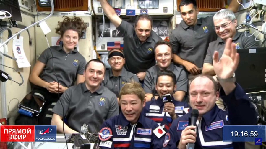 Als sich Maezawas Aufregung etwas gelegt hatte, hat er auch nur wenige Worte gesprochen und ganz versonnen mit dem Mikro gespielt, ... das dreht sich so schön in der Schwerelosigkeit. Fotos: ZUP/Roskosmos