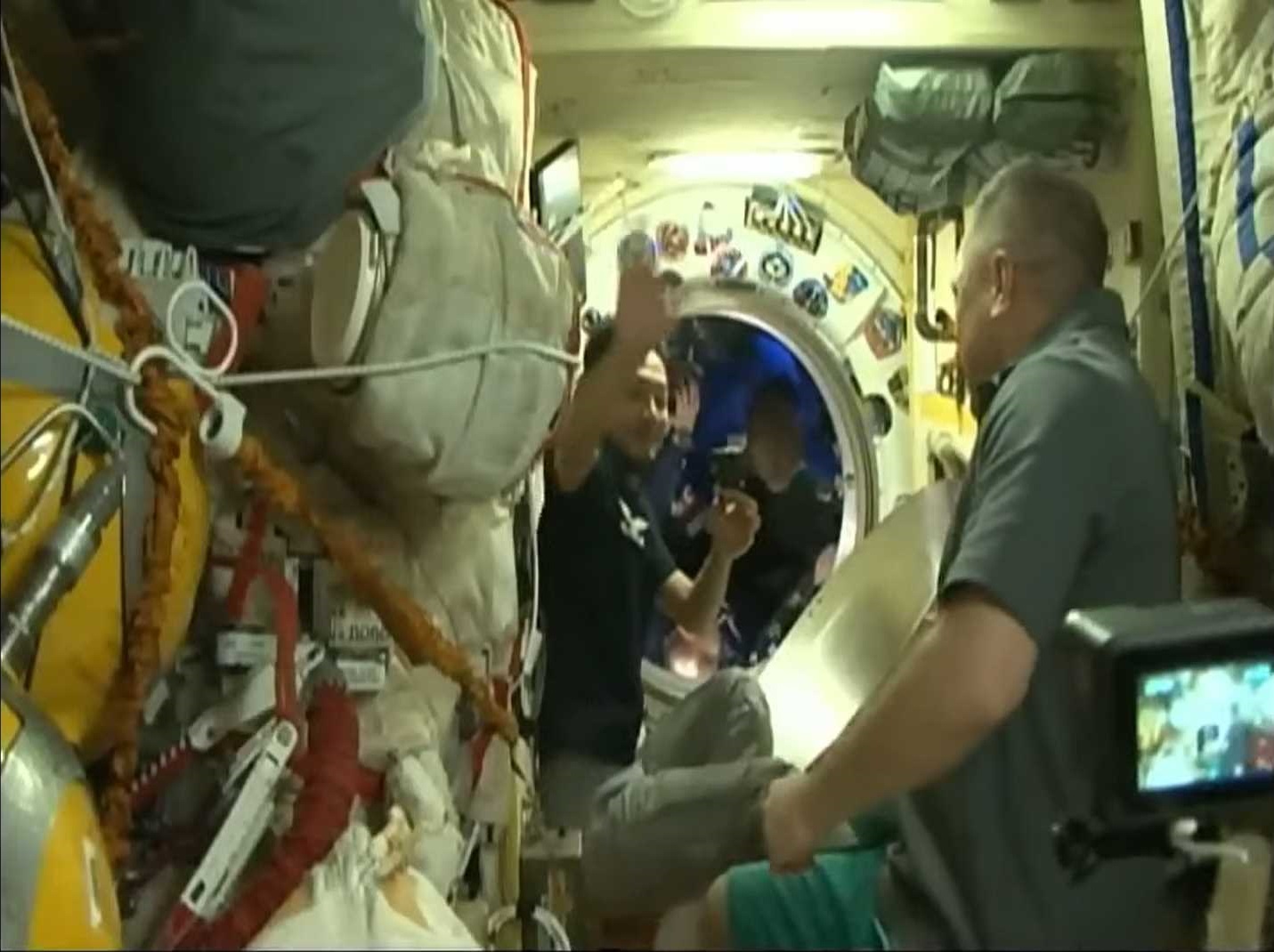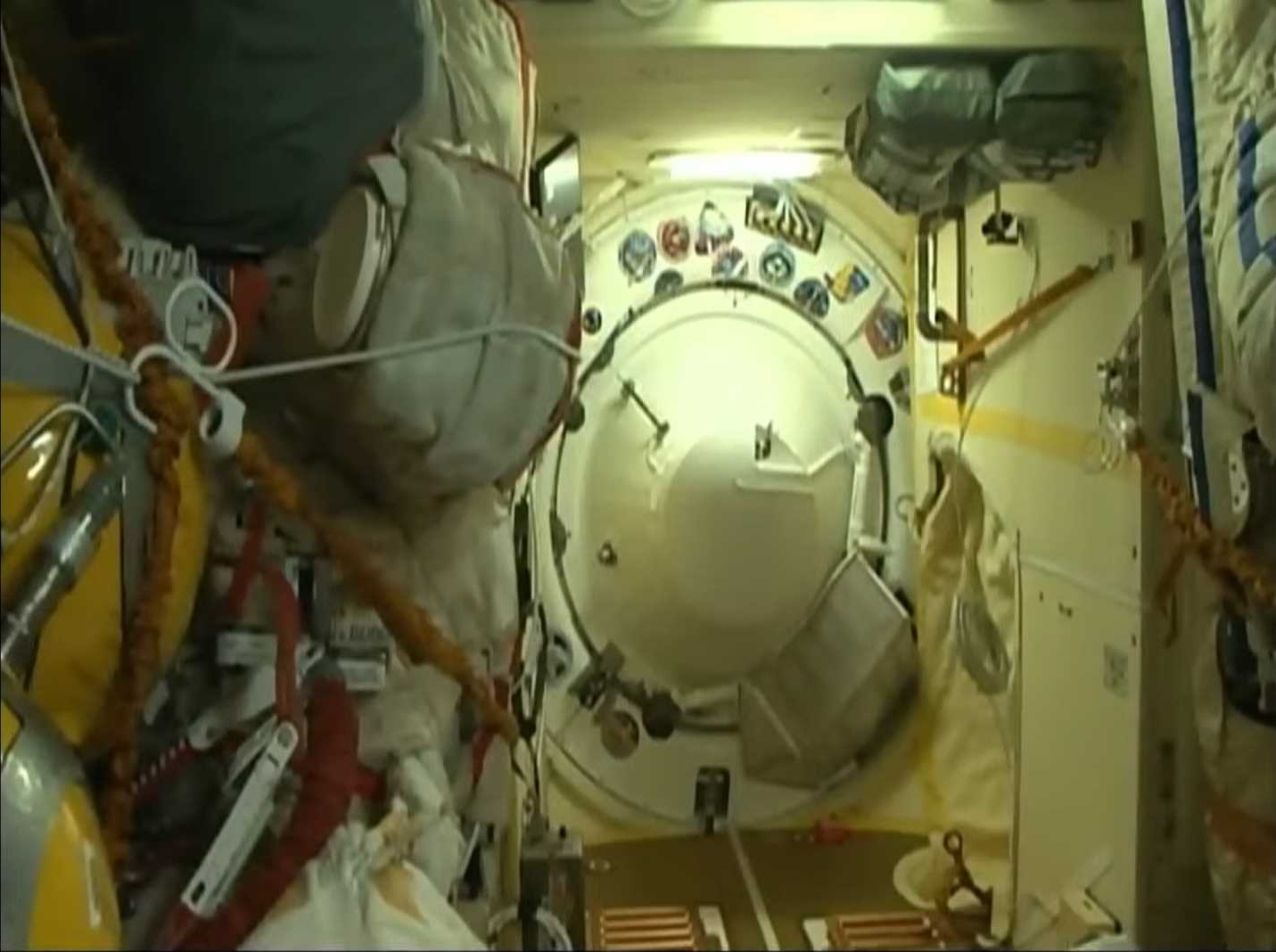 Luke öffnen ... Nachdem die Luke auf der ISS-Seite schon längere Zeit offen war, aber die von Sojus MS-20 nicht, wurde von Schkaplerow einige Male "angeklopft" woraufhin dann die Luke sich öffnete ...