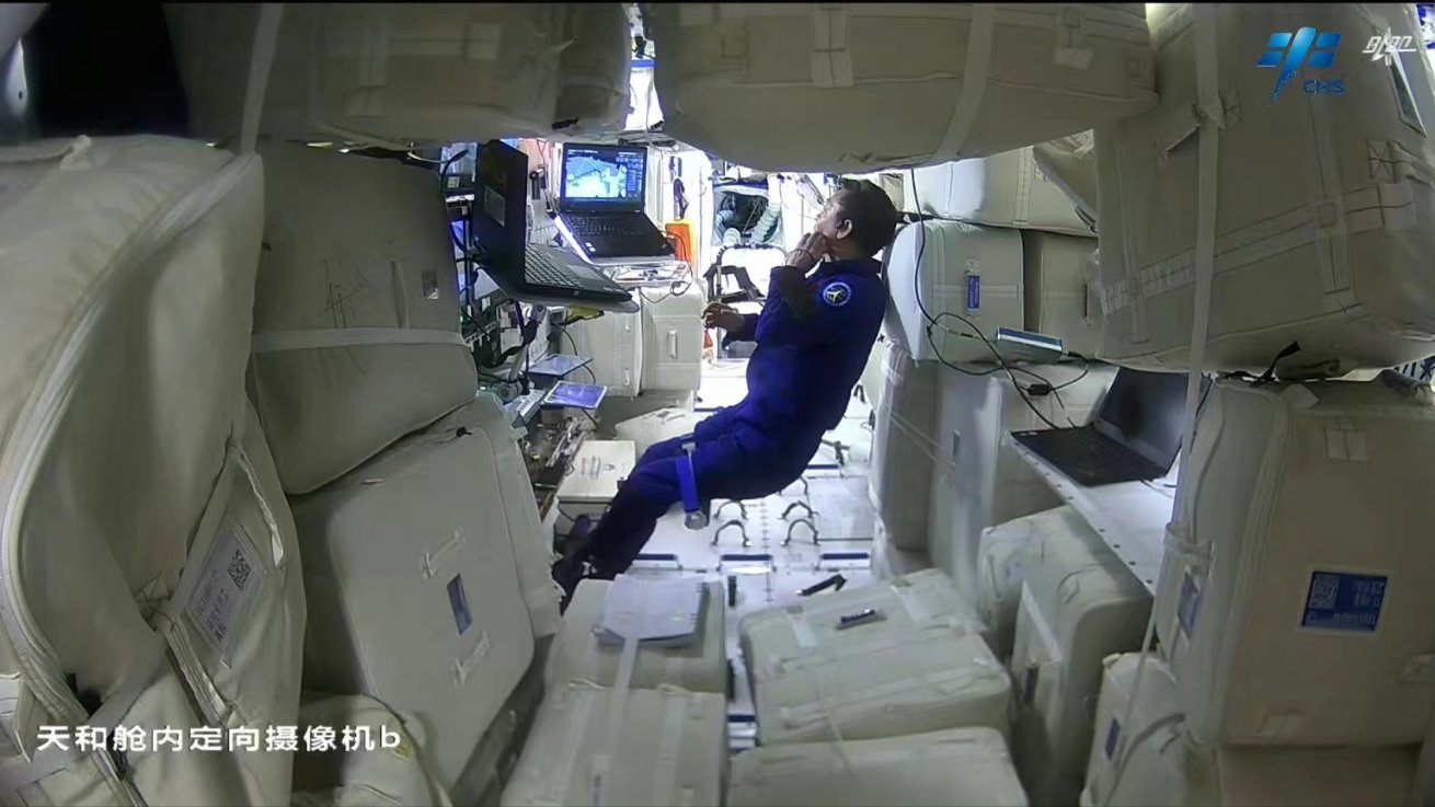 Der Taikonaut DENG QINGMING unterstützte den Ausstieg, indem er den Roboterarm im Tianhe Kern Module bediente.