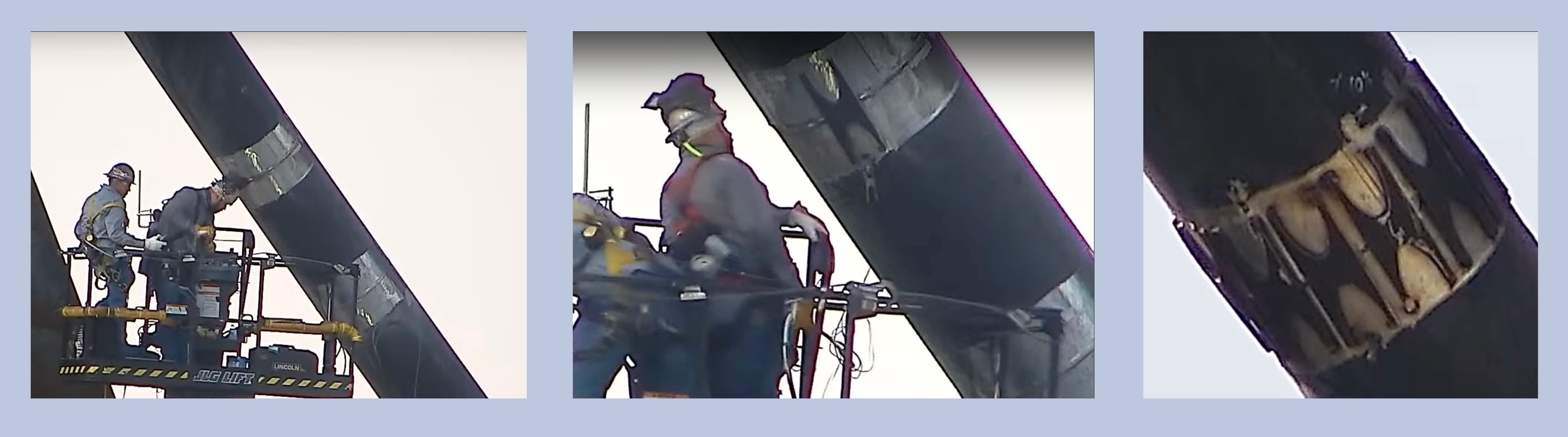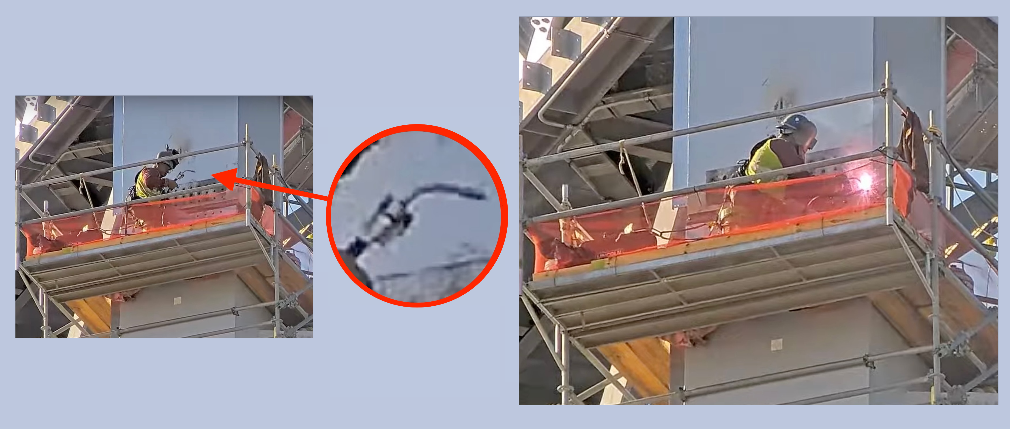 aber ich konnte gerade für Blondi & Co. das Schweißen an der Verbindung der Module einfangen. Vielleicht kann ja einer anhand der (unscharfen) Vergrößerung erkennen, um welches Schweißverfahren es sich handelt? ... wie gesagt, man sieht keine Gasflasche und keine manuelle Drahtzuführung, der Schweißdraht muss aus der Schweißpistole kommen.