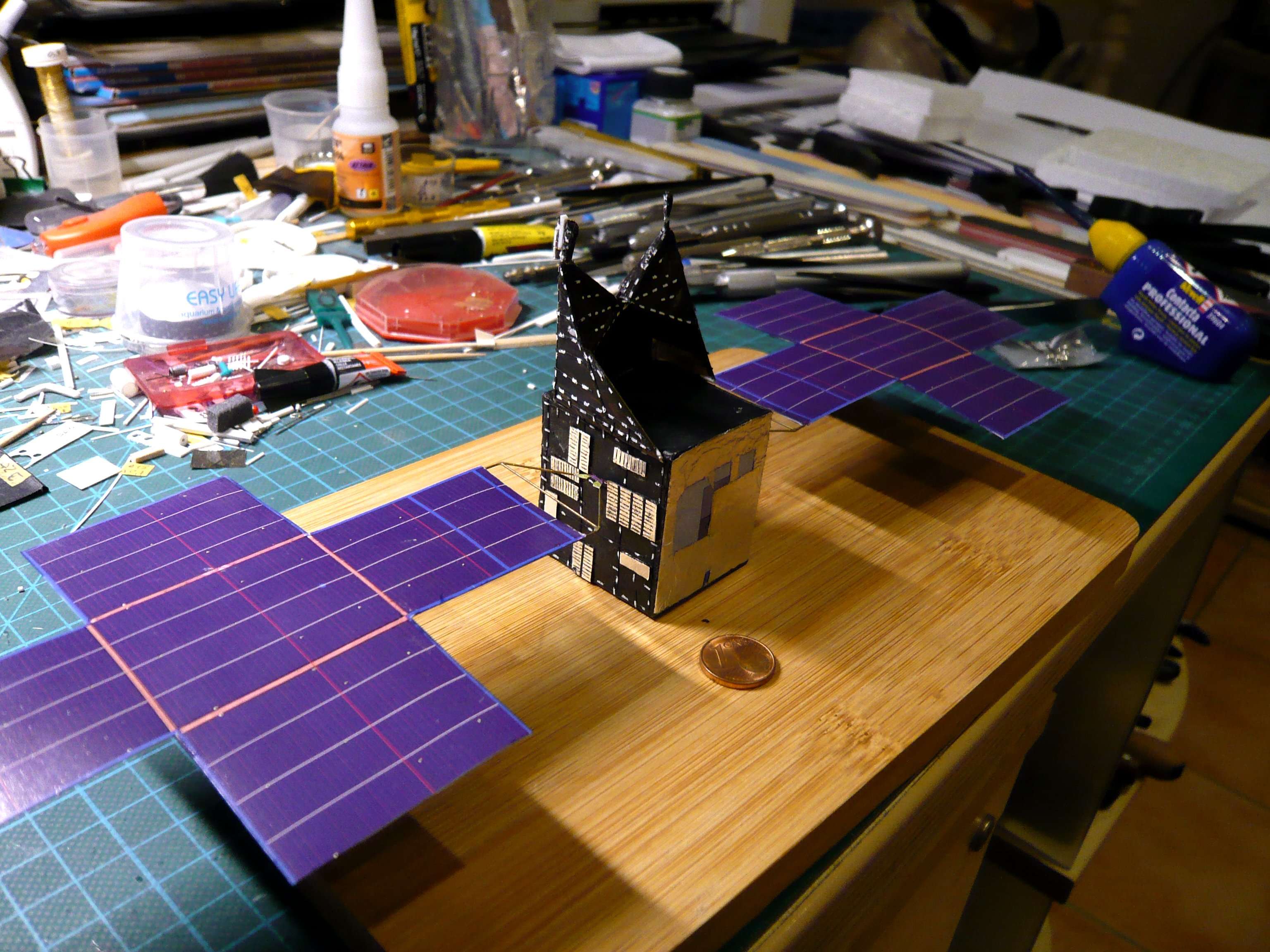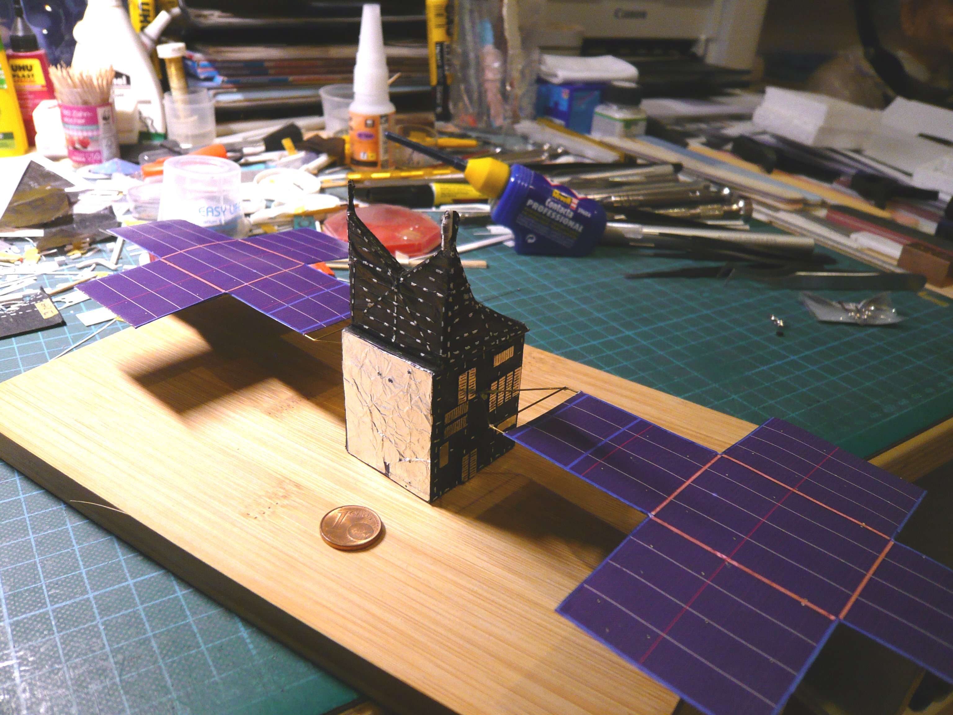 X-Band High Gain Antenna dazu gestellt, die gerade noch so dazwischen passt.