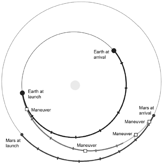 Wenn die Sonde die Marsbahn in der Nähe des Mars erreicht hat, muss sie noch auf weniger als die Fluchtgeschwindigkeit des Planeten (5,03 km/s) abbremsen, um von ihm eingefangen zu werden.